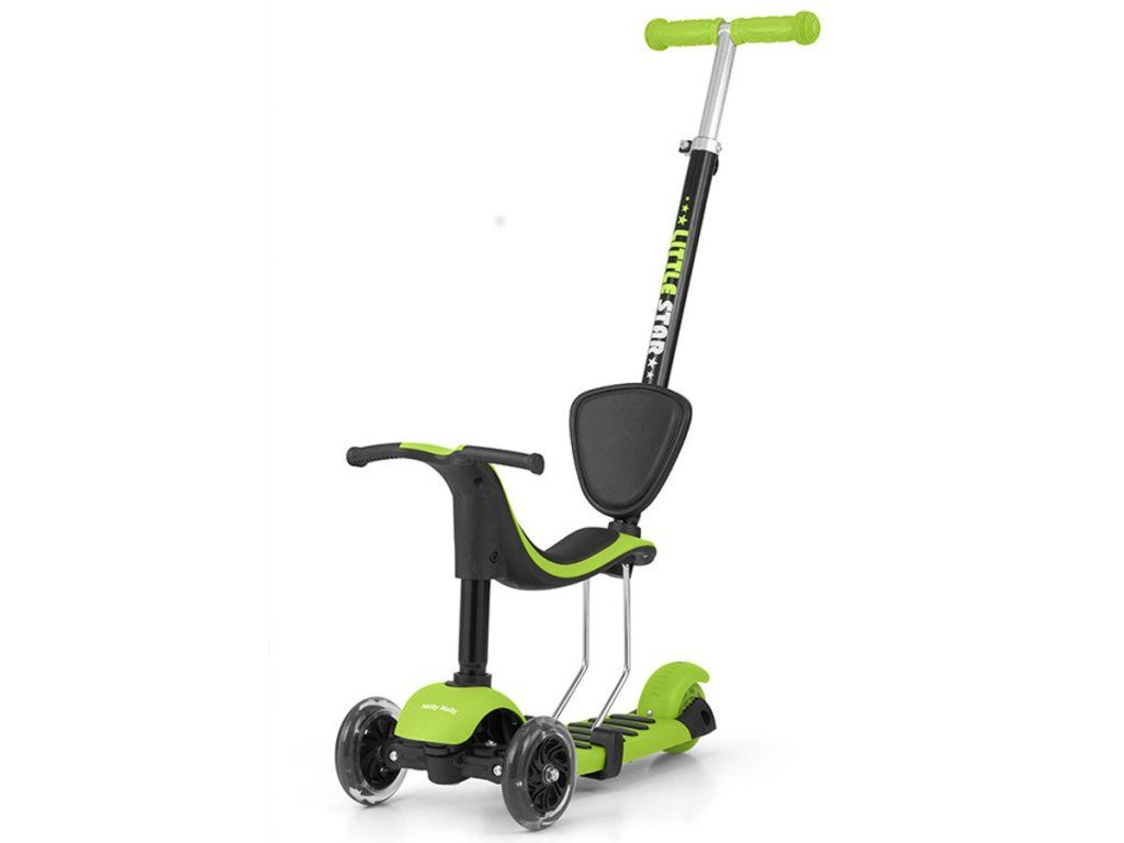 Super štýlová detská kolobežka Milly Mally Little Star. Nie je to len kolobežka, je to tiež odrážadlo pre deti od druhých narodenín, ktoré má sedadlo aj vodiacu tyč pre rodičov. Nosnosť do 20 kg. Sedadlo aj vodiacu tyč možno jednoducho zložiť a z odrážadlá sa razom stane kolobežka s nosnosťou do 50 kg.Charakteristika: