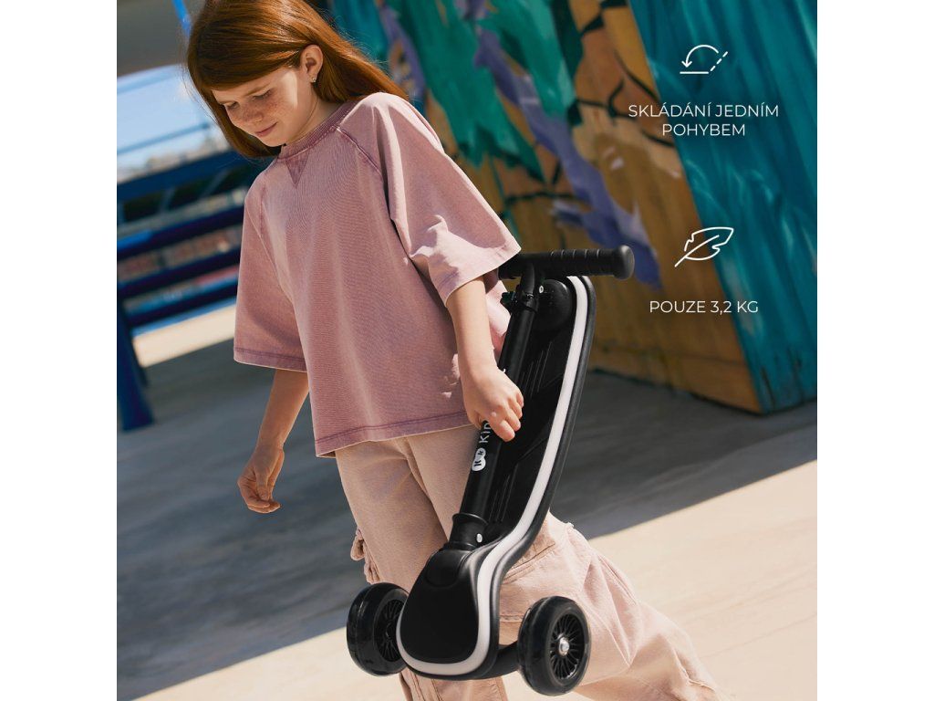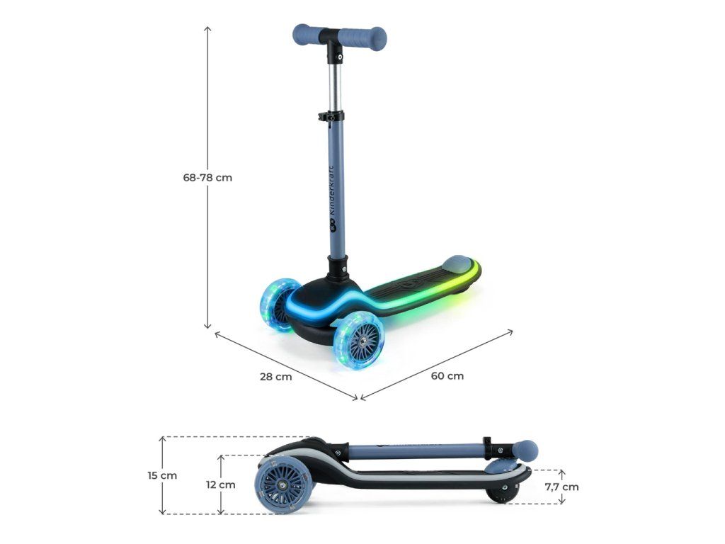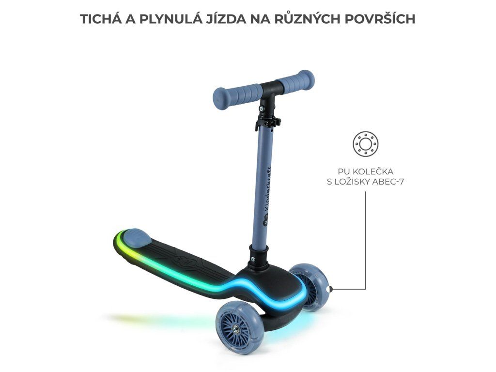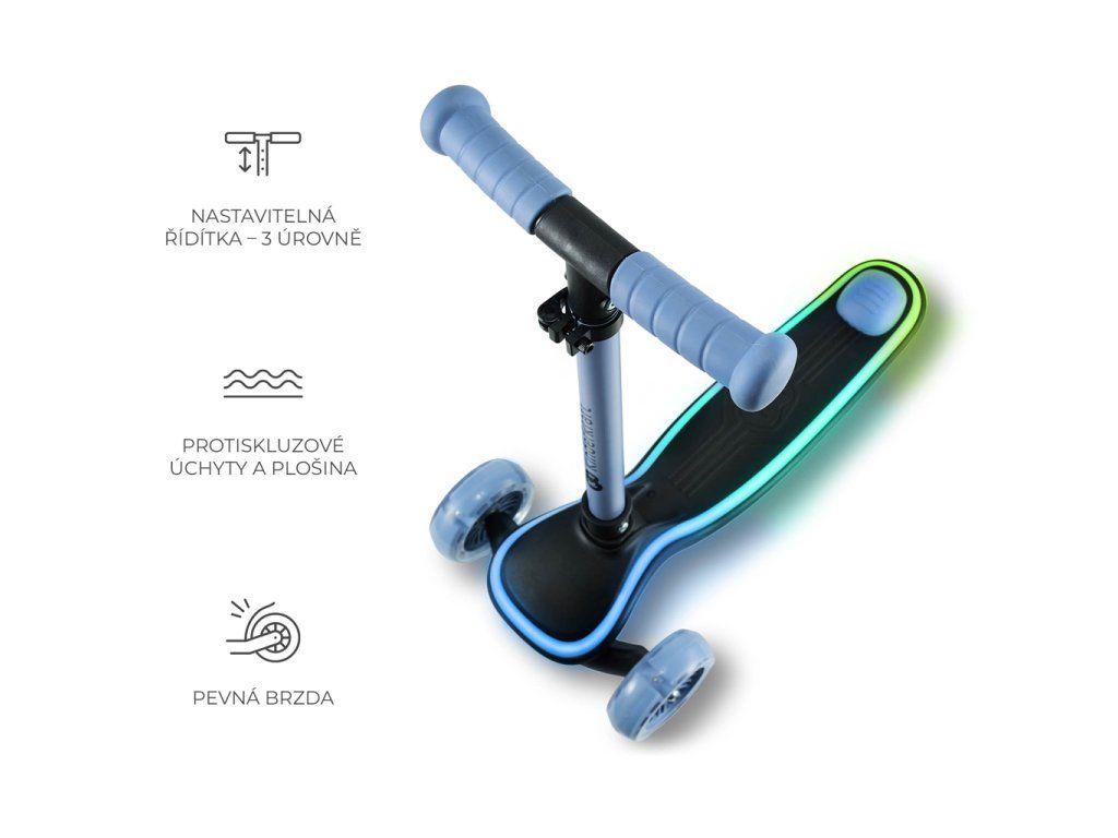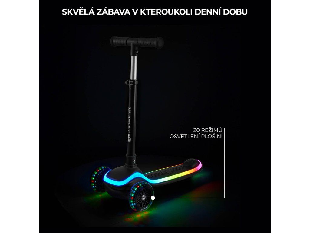 - Moderný dizajn – farebné efekty zaručia, že kolobežka upúta na prvý pohľad