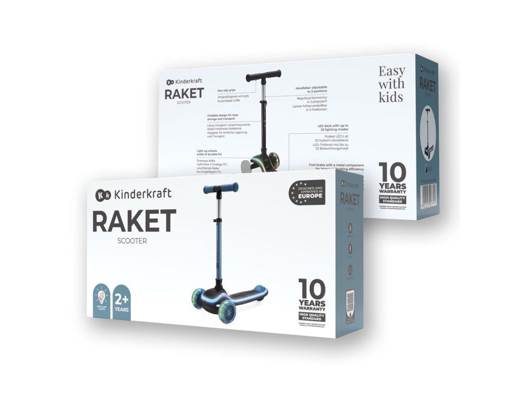 Zábava a bezpečnosť počas celého dňa. RAKET je detská kolobežka s intuitívnym ovládaním pomocou náklonu tela, ktorá podporuje rozvoj rovnováhy a koordinácie. Vďaka svietiacej LED plošine a RGB kolieskam je jazda nielen vzrušujúca, ale aj bezpečnejšia po zotmení. Kolobežka je ideálna na prvé jazdecké skúsenosti – s jednoduchým skladaním, nastaviteľnou výškou riadidiel a hladkou jazdou na každom povrchu.Vlastnosti:
