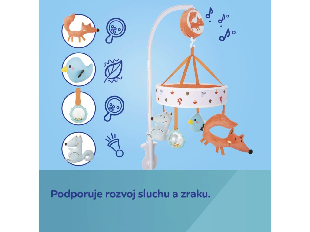 Kolotoč nad detskú postieľku s melódiou z kolekcie FOX podporuje vývoj bábätka od prvých dní života – skvele stimuluje zrakovú, sluchovú a pohybovú koordináciu dieťaťa. Farebné hračky priťahujú pozornosť bábätka a podporujú rozvoj zraku. Pekné a pokojné zvuky a melódie vaše bábätko upokojí a uľahčí zaspávanie. Tento plyšový kolotoč nad postieľku má pohodlnú rukoväť, vďaka ktorej sa dá ľahko a stabilne pripevniť. Kolotoč nevyžaduje batérie, pretože motorček sa navíja ručne. Každá hračka má pre dieťa inú atrakciu: šuštiace prvky, piskot alebo hrkálku. Kolotoč je určený pre deti, ktoré sa ešte nevedia samostatne pohybovať.