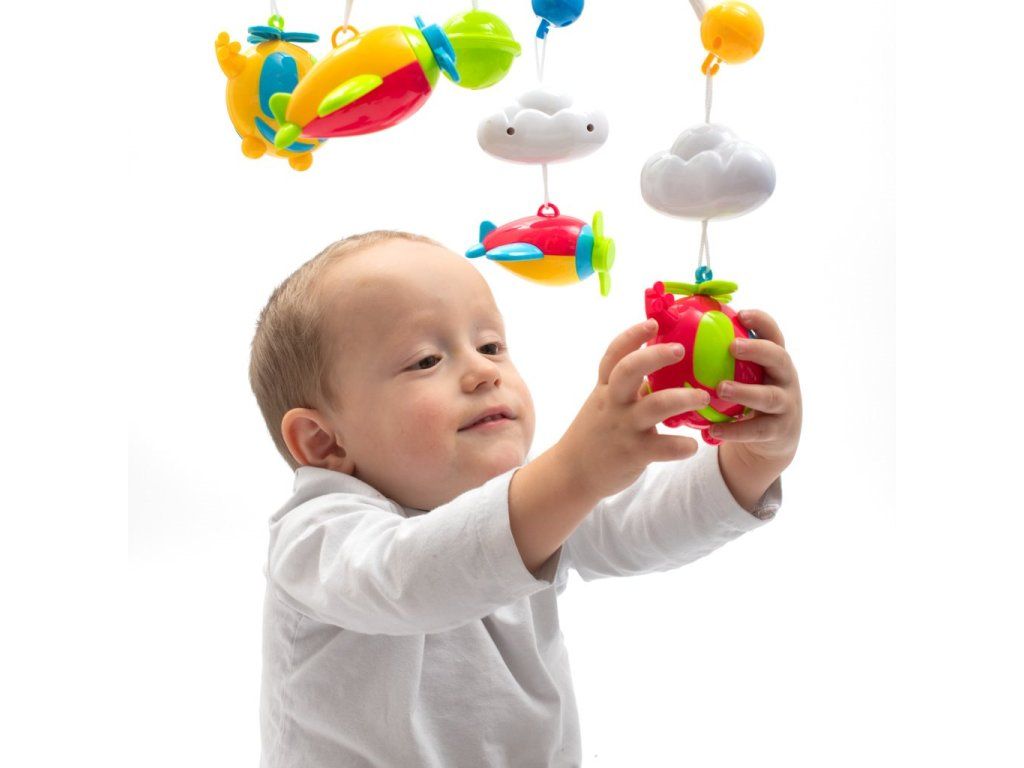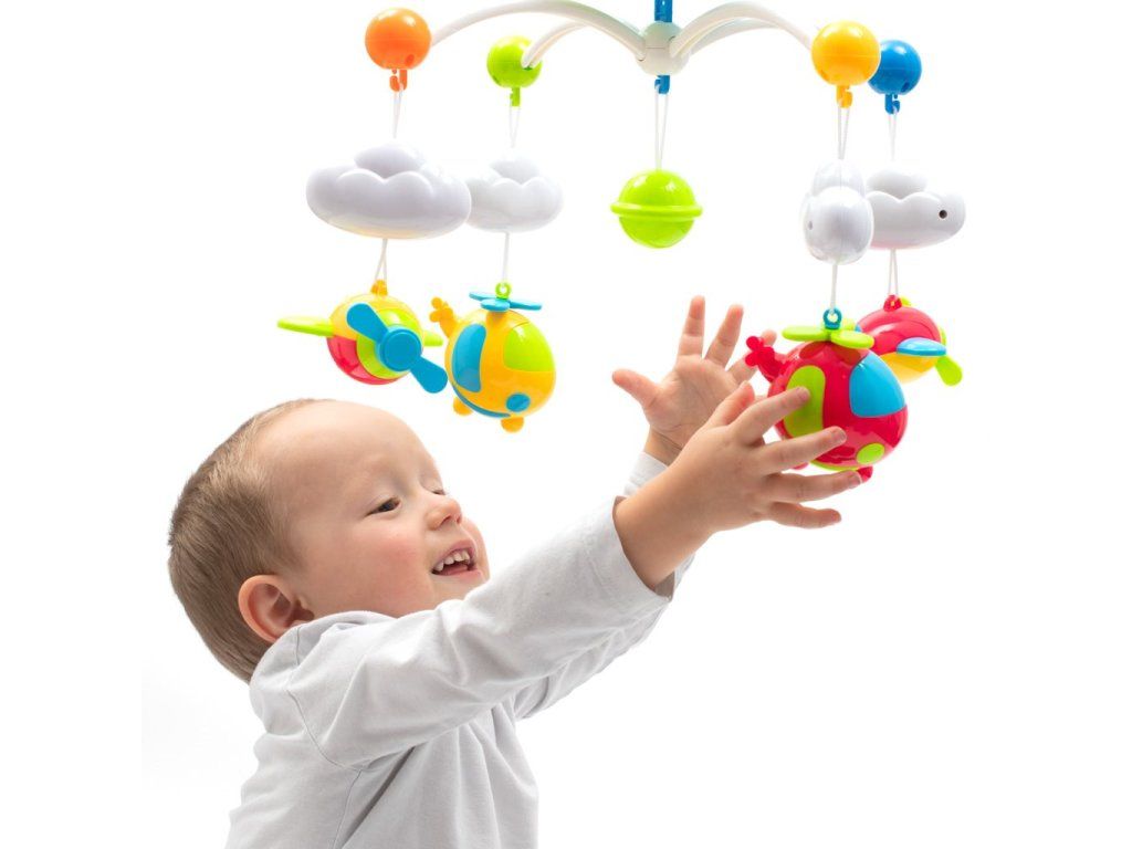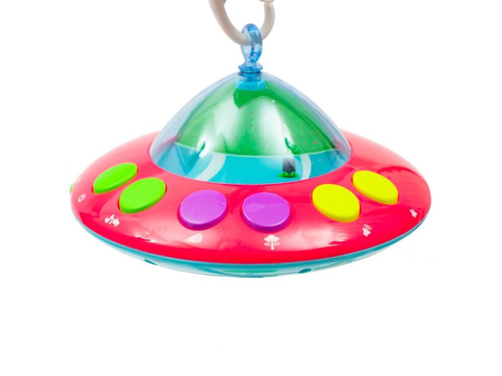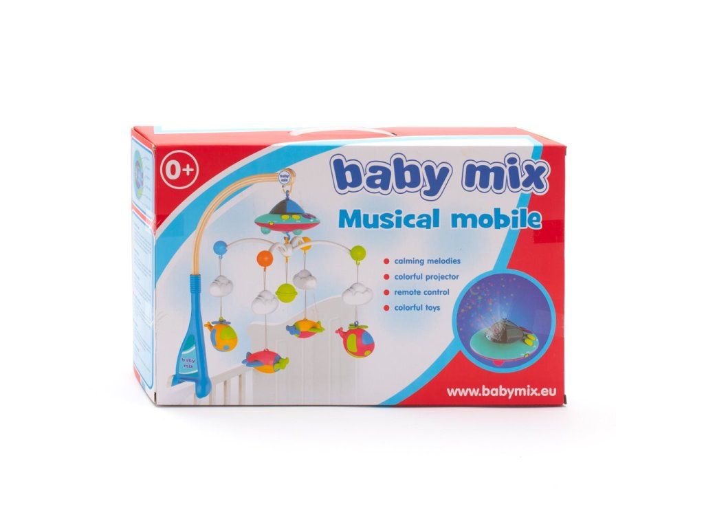 Kolotoč nad postieľku so svetelným projektorom a ovládačom Baby Mix je určený najmenším deťom, ktoré sa ešte samé nepohybujú. Rozvíja zrakovo-pohybovú koordináciu dieťaťa a upokojuje ho pred zaspaním. Kolotoč má svetelný projektor s hviezdičkami, ktorý mení farbu a plní aj funkciu nočné lampičky. Pomocou tlačidiel na projektore možné nastaviť melódiu, rotáciu kolotoče a premietanie hviezdičiek. Figúrky možno odmontovať a používať ako hrkálky. Hrací strojček ponúka rôzne melódie. Má nastaviteľnú hlasitosť. Výška jednotlivých figúrok cca 10 cm. Batérie nie sú súčasťou balenia - 3 x AA 1,5.- svetelný projektor (nočná obloha)