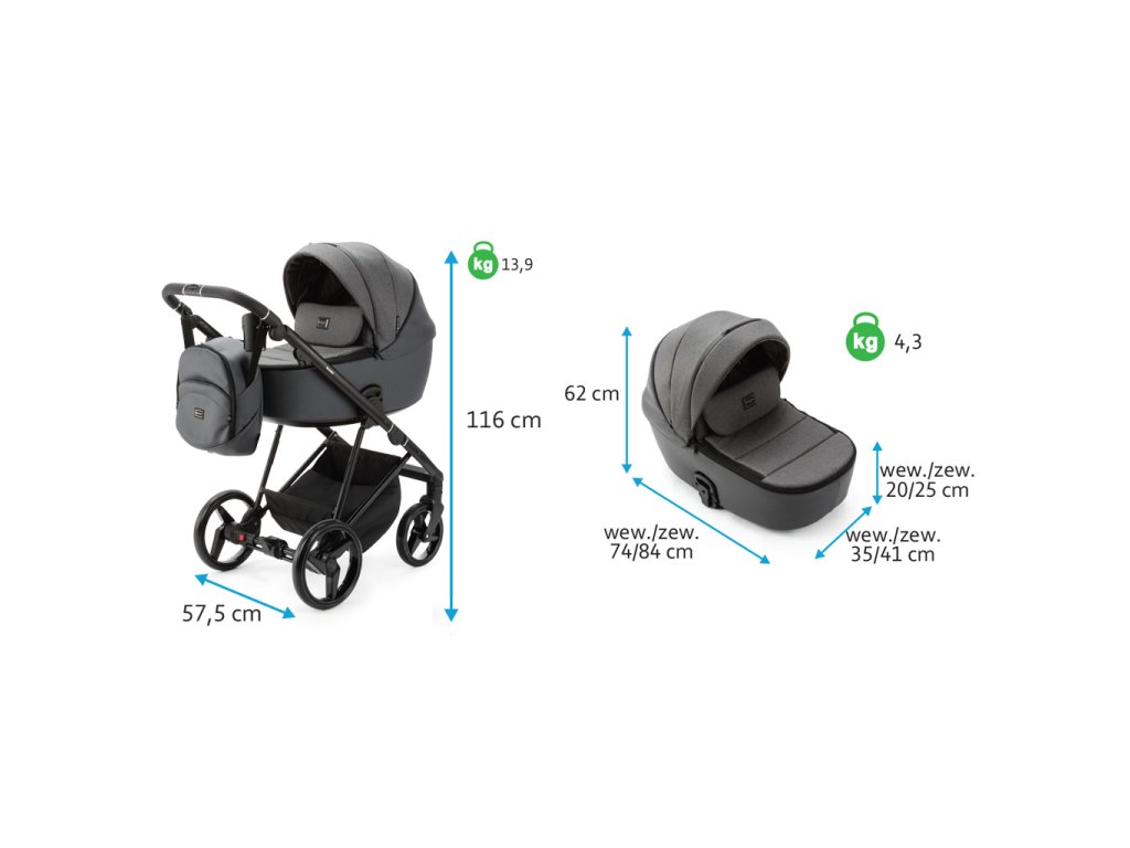- Rozmery zloženého kočíka: 116 x 57,5 x 110-119 cm (D x Š x V)
