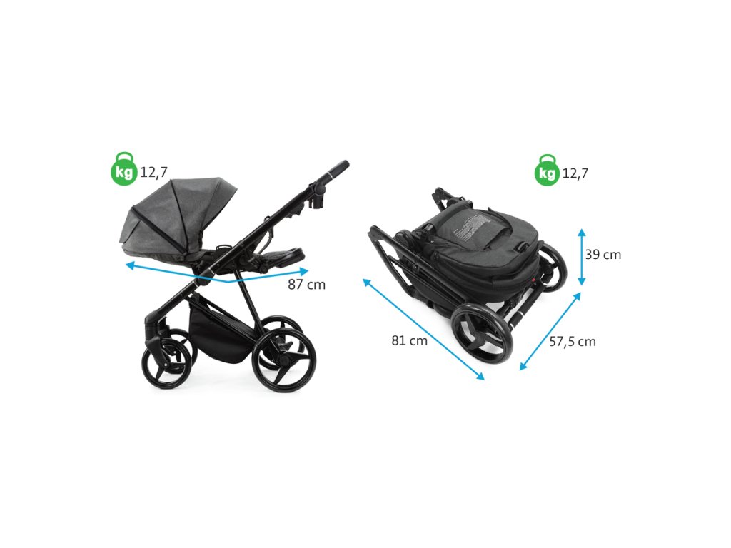 - rozmery zloženého kočíka: 81 x 57,5 x 39 cm (D x Š x V)