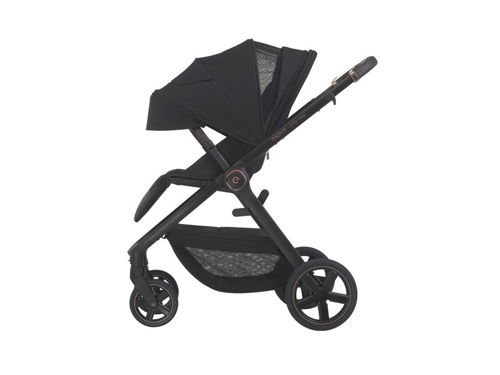 Športovú verziu kočíka Espiro Only môžete namontovať na rám presne tak, ako to vaše dieťa preferuje - čelom alebo zadom k smeru jazdy. Má opierku s niekoľkými stupňami nastavenia polohy. Môžete ju sklopiť do úplne vodorovnej polohy, keď vaše dieťa bude chcieť zdriemnuť, alebo ju zdvihnúť, aby zvedavé dieťa mohlo sedieť a pozorovať svet. Systém nastavenia sa týka aj podnožky. Vďaka tomu prispôsobíte konštrukciu kočíka výške dieťaťa.