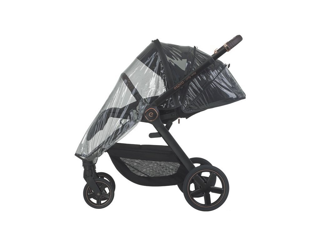 Korba Espiro Only je vyrobená z vodeodolnej tkaniny s filtrom UPF 50+. Súčasťou je aj golier Hot&Cool a pláštenka proti dažďu.