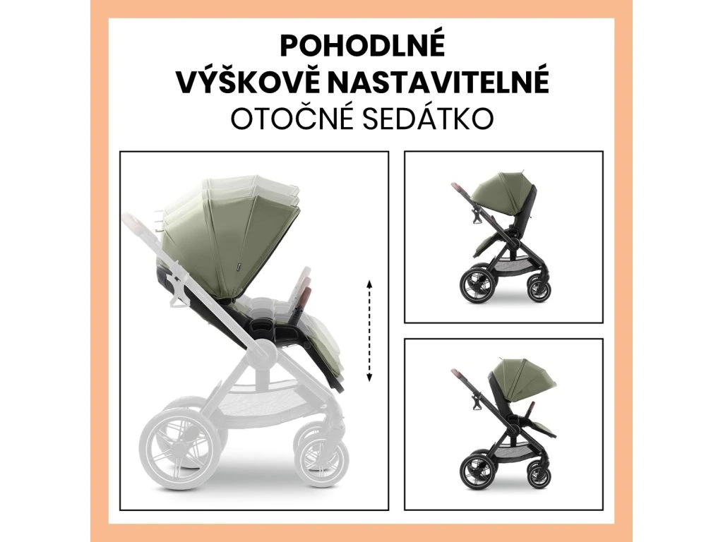 POHODLNÉ SEDADLO S DVOMA SMERMI POHĽADU // Na zmrzlinu, na kávu či do parku: všade sa vám kočík dokonale prispôsobí vďaka výškovo nastaviteľnému otočnému sedadlu, navyše s extra dlhým sedením a polohovaním poskytuje maximálne pohodlie v každej situácii.