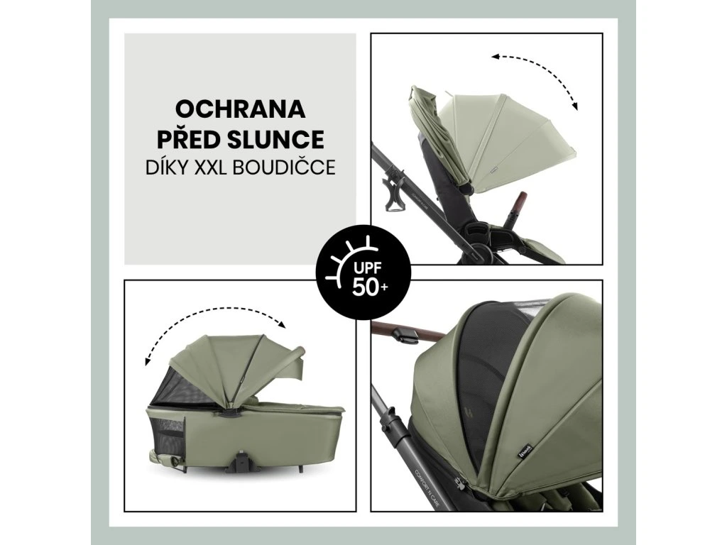 XL STRIEŠKA PRE MAXIMÁLNU OCHRANU PRED SLNKOM // Sedadlo aj vanička majú predĺžiteľnú slnečnú striešku s ochranou proti UV žiareniu 50+ a veľké sieťované okienka. Vďaka tomu je vaše dieťatko optimálne chránené a pritom si môže užívať čerstvý vzduch.