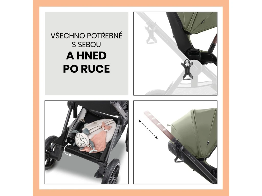 VŠETKO SO SEBOU - A PO RUKE // Vďaka praktickému držiaku na nápoje na výškovo nastaviteľnej teleskopickej rukoväti máte svoj nápoj vždy po ruke. Všetko, čo vy a vaše maličké budete potrebovať, sa zmestí do extra veľkého výklopného koša!