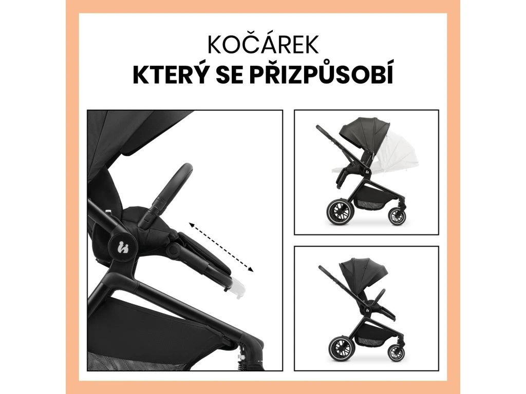 KOČIAREK, KTORÝ SA VŠETKÝM PRispôsobÍ - S DVOMA POHĽADMI // Otočné sedadlo s predĺženou opierkou nožičiek, extra dlhé sedadlo a polohovanie chrbtovej opierky jednou rukou, výškovo nastaviteľný 5-bodový bezpečnostný pás sa dokonale prispôsobí vášmu dieťaťu.