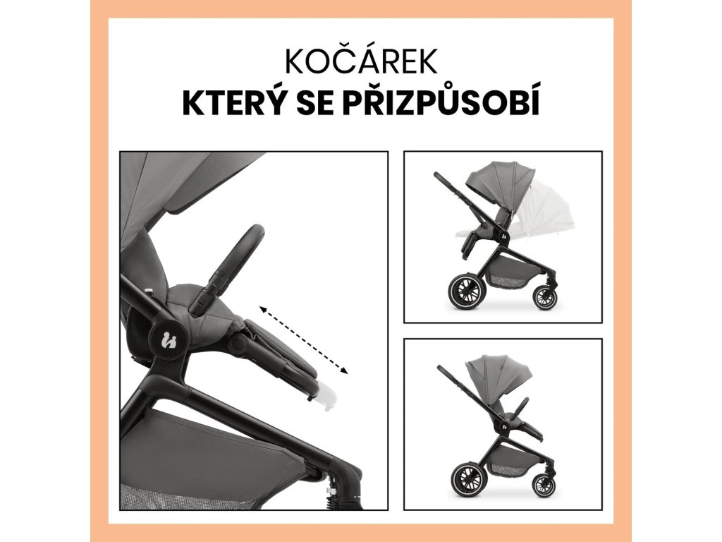 KOČIAREK, KTORÝ SA VŠETKÝM PRispôsobÍ - S DVOMA POHĽADMI // Otočné sedadlo s predĺženou opierkou nožičiek, extra dlhé sedadlo a polohovanie chrbtovej opierky jednou rukou, výškovo nastaviteľný 5-bodový bezpečnostný pás sa dokonale prispôsobí vášmu dieťaťu.