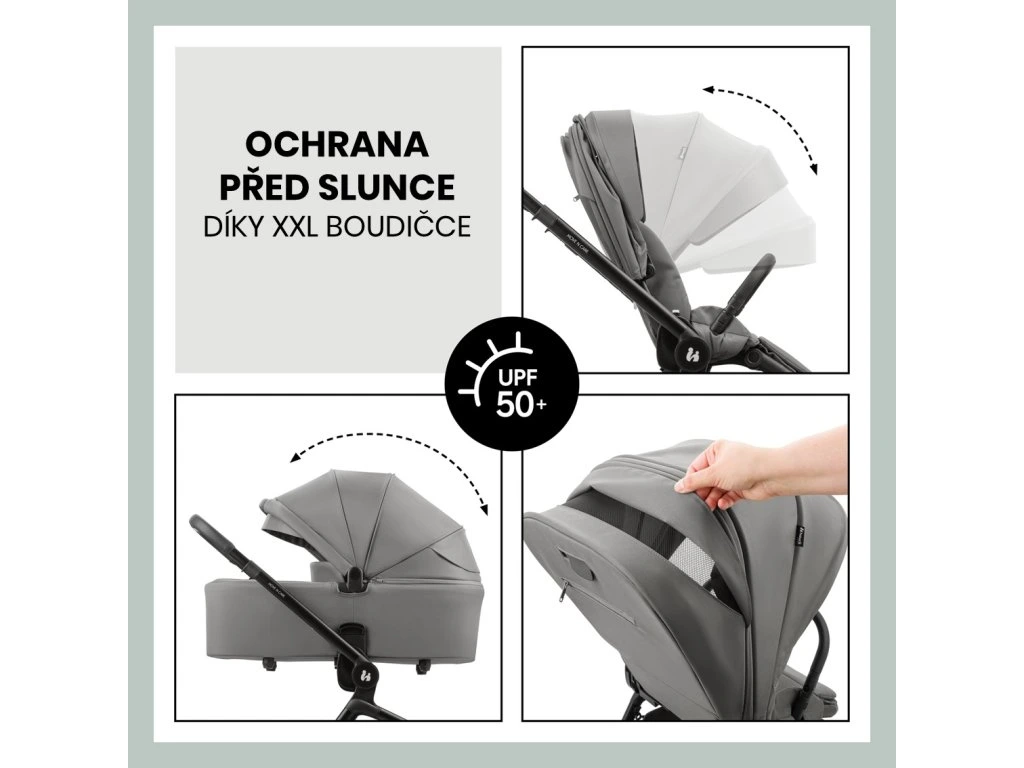 XL STRIEŠKA S MAXIMÁLNOU OCHRANOU PROTI SLNKU // Sedadlo aj vanička sú vybavené priestrannou strieškou s ochranou proti UV žiareniu 50+ a sieťovaným okienkom. Vaše dieťatko je tak optimálne chránené a môže si neustále užívať dostatočný prísun čerstvého vzduchu.