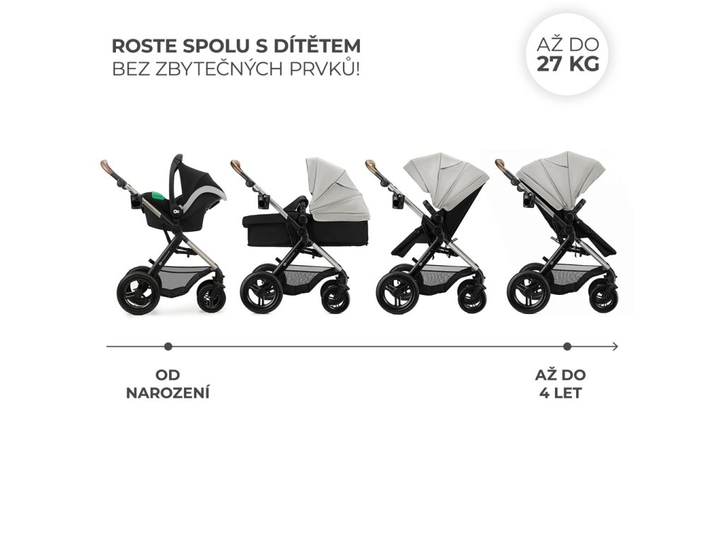 - Pre deti od narodenia do 27 kg (maximálna hmotnosť dieťaťa 22 kg, nosnosť košíka 5 kg).