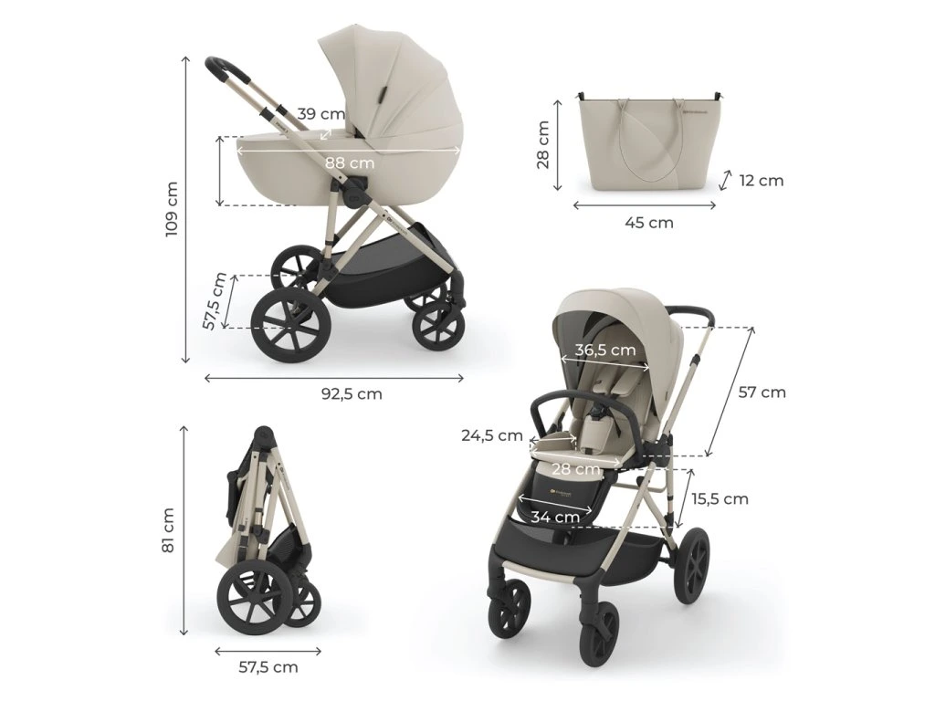 - Rozmery rozloženého kočíka: verzia s hlbokou korkou: 92,5(d) x 57,5(š) x 109(v) cm.