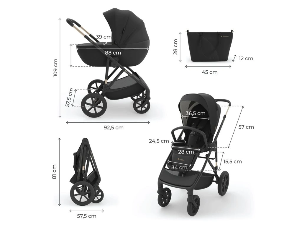 - Rozmery rozloženého kočíka: verzia s hlbokou korkou: 92,5(d) x 57,5(š) x 109(v) cm.