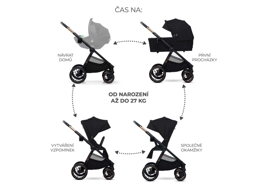 - Od narodenia do 22 kg – kočík má veľkú vaničku s mäkkým matracom, ktorú môže dieťa používať do 9 kg alebo do chvíle, keď sa začne prevracať. Sedadlo kočíka je možné namontovať smerom dopredu alebo dozadu voči smeru jazdy.