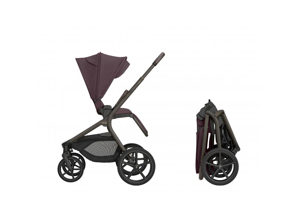 Po zložení kočík samostatne stojí. Pre ľahké prenášanie je pripravený popruh cez rameno a madlo.