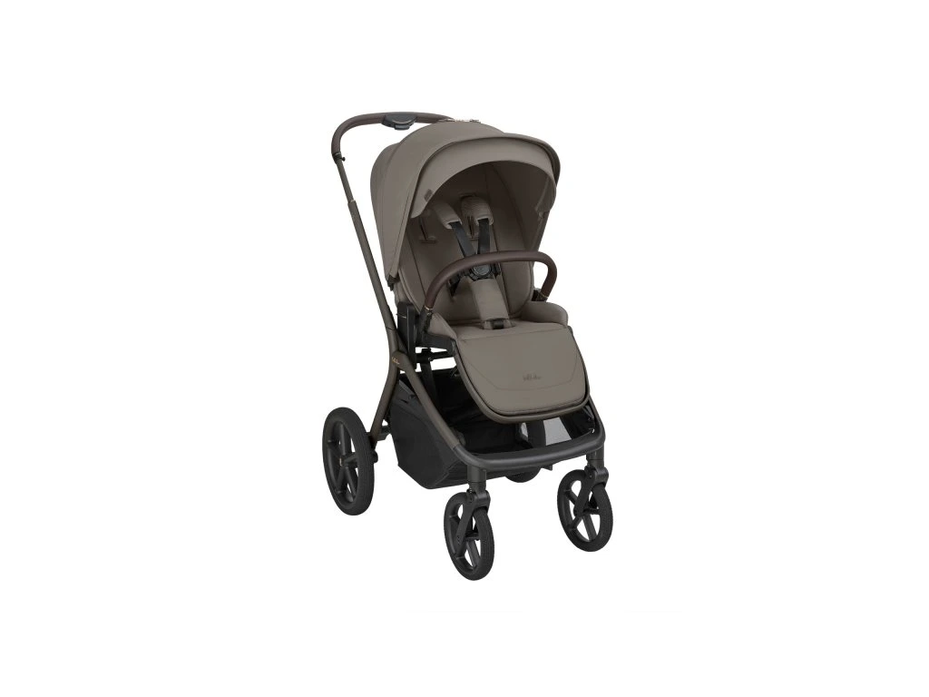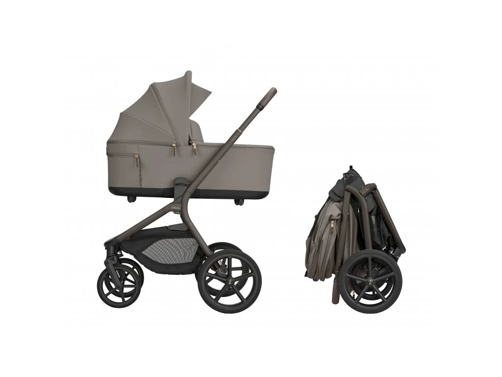 Po zložení kočík samostatne stojí. Pre ľahké prenášanie je pripravený popruh cez rameno a madlo.