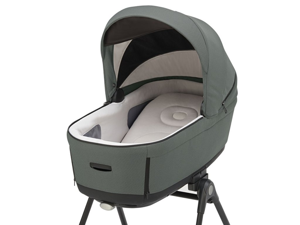 Kombinovaný kočík Aptica XT 4v1 Recline sa skladá z: priestrannej hlbokej vaničky XXL s 5-timi okienkami, matraca, Welcome PadTM, stojana Stand UpTM, autosedačky Darwin Recline R129, športové sedačky All season s búdkou, nánožníka, košíka, držiaka pohárika a nového odľahčeného adaptívneho podvozku Aptica XT.