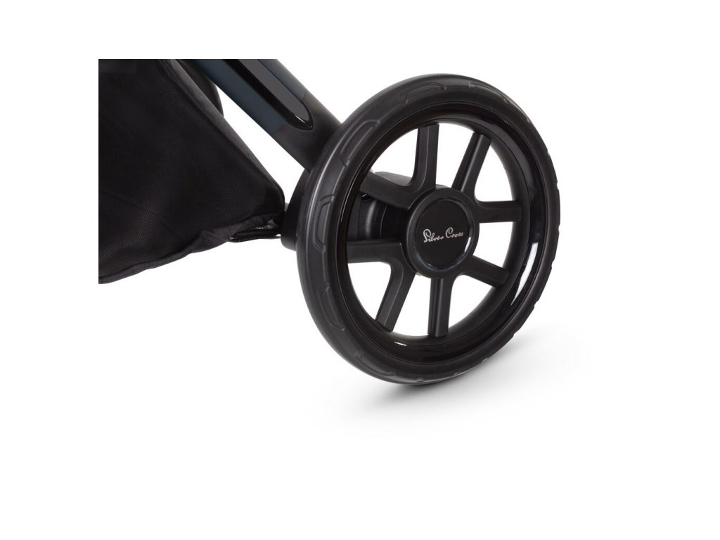 Hladkú jazdu zaručuje kvalitné odpruženie všetkých štyroch kolies aj veľké pneumatiky odolné proti prepichnutiu. Otočné predné kolesá umožňujú uzamknutie otáčania. Robustná nožná brzda sa ľahko ovláda bez rizika odrenia topánok. Teleskopická rukoväť ponúka nastavenie podľa výšky rodiča.