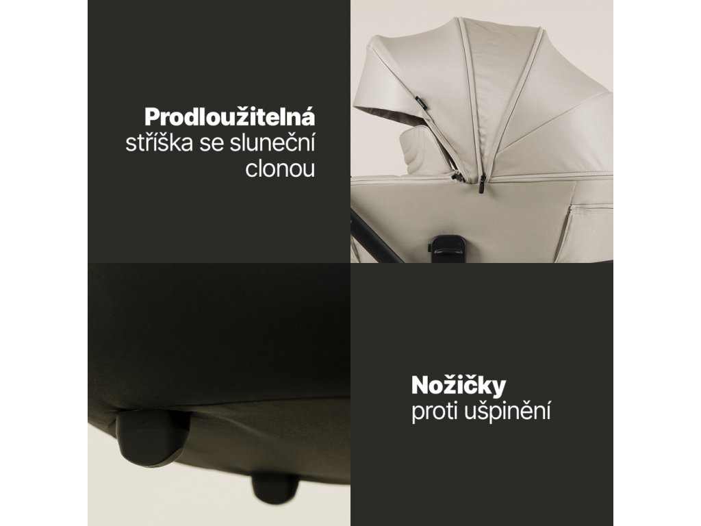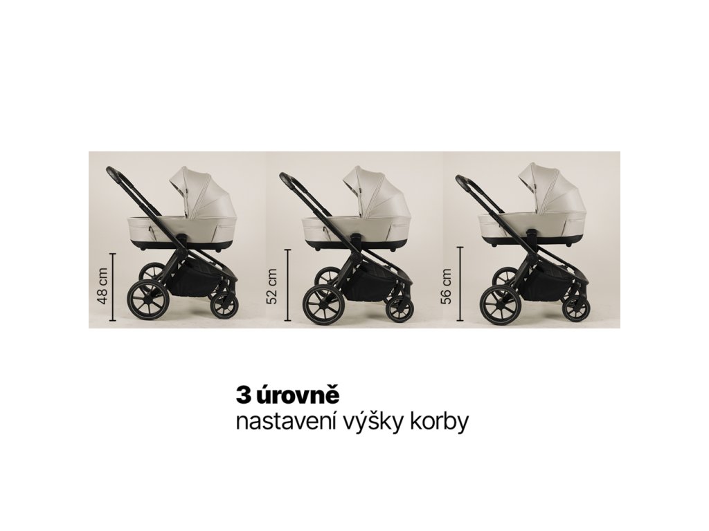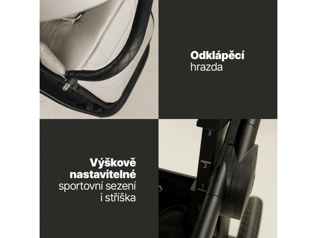 Kočík umožňuje otočné športové sedenie, ktoré môžete nasmerovať v smere aj proti smeru jazdy. Veľkou výhodou je výškovo nastaviteľné sedenie aj strieška, každé v troch úrovniach. Prispôsobí sa tak nielen výške rodiča, ale aj rastu dieťaťa.