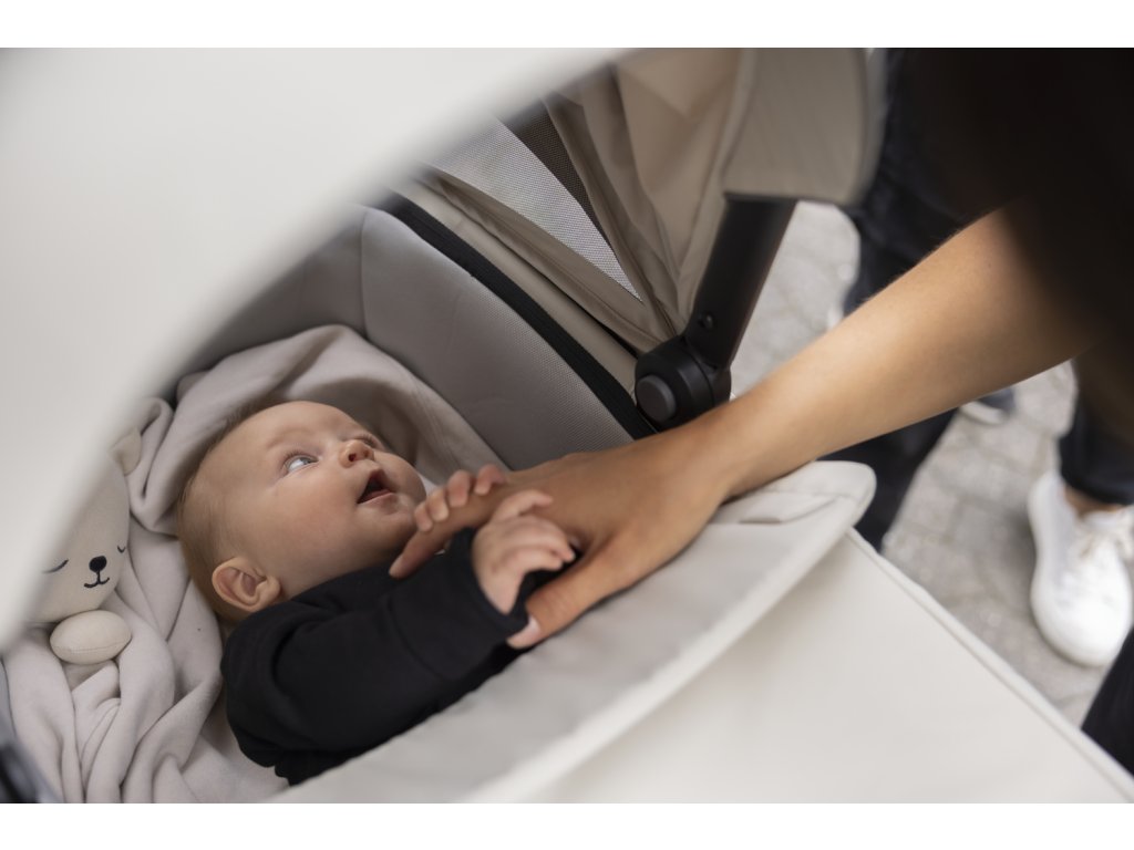 Celá strieška s vetraním, vstavaná opierka nôh a pohodlné sedadlo s nastaviteľným sklonom.