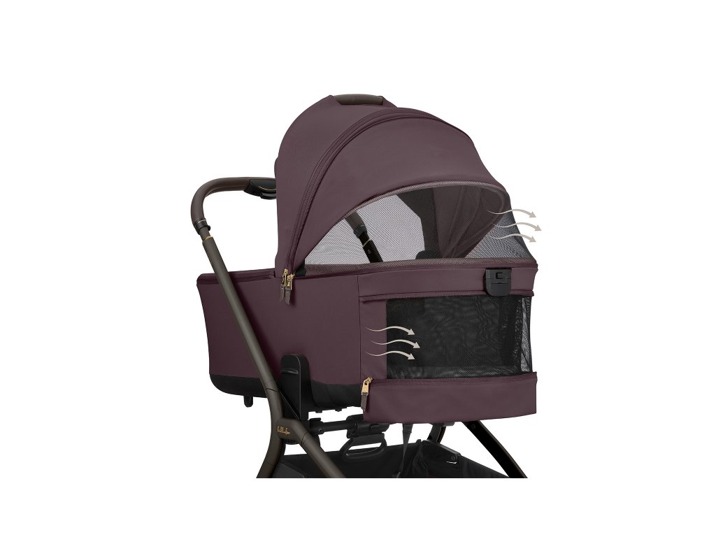 Pre pohodlie dieťaťa je súčasťou obojstranný mäkký matrac so zimnou stranou z kvalitného zamatového materiálu a letnou stranou z priedušnej sieťoviny pre lepšiu ventiláciu. Strieška má zipsové predĺženie, slnečnú clonu a dopĺňa ju extra slnečná clona pre maximálny tieň. Ventiláciu zaisťujú sieťované vetracie otvory na strieške aj v oblasti hlavy. Praktická je aj vrecko na telefón na zips.Vodeodolný textilný materiál s UPF 50+ chráni dieťa pred poveternostnými vplyvmi a slnečným žiarením.