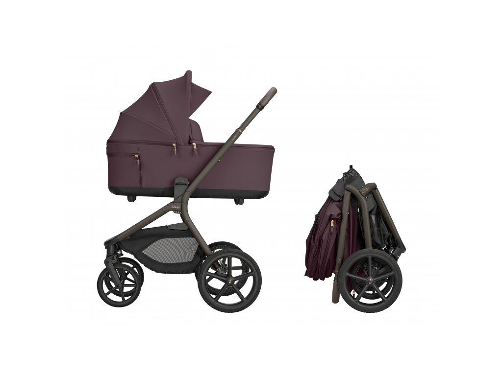 Po zložení kočík samostatne stojí. Pre ľahké prenášanie je pripravený popruh cez rameno a madlo.