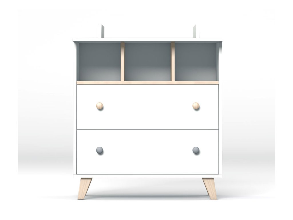 Komoda poskytne dostatok miesta na všetko potrebné pre Vaše bábätko, v hornej časti je otvorená polička pre veľmi frekventované potreby alebo pre veci, po ktorých potrebujete siahnuť ospalá poslepiačky, nižšie dva šuplíky chrániace veci pred prachom. Komoda je optimálne vysoká pre pohodlné prebaľovanie. Súčasťou dodávky je prebaľovací nadstavec, ktorý neskôr môžete odmontovať a komodu ďalej používať bez neho.