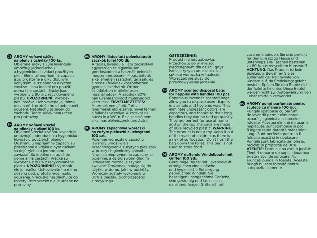 - Až 80 % materiálu použitého na výrobu vreciek AROMA pochádza z recyklácie. Výberom vrecúšok AROMY sa staráte nielen o hygienu a pohodlie, ale podporujete aj ochranu životného prostredia.