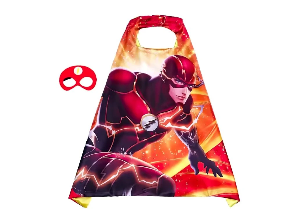 Súprava obsahuje štýlový plášť s výraznou potlačou superhrdinu Flasha a červenú masku s ikonickým bleskom, ktorá dotvára autentický vzhľad hrdinu zo sveta DC Comics.