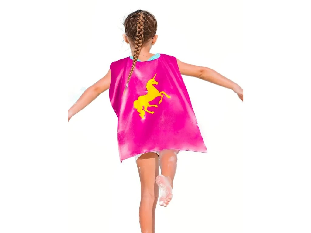 Plášť v sýtej ružovej farbe zdobí veľký zlatý jednorožec, ktorý pôsobí elegantne a hravo zároveň. Súčasťou balenia je aj maska v rovnakej farebnej kombinácii, vďaka ktorej sa dieťa ľahko premení na tajomnú rozprávkovú bytosť.