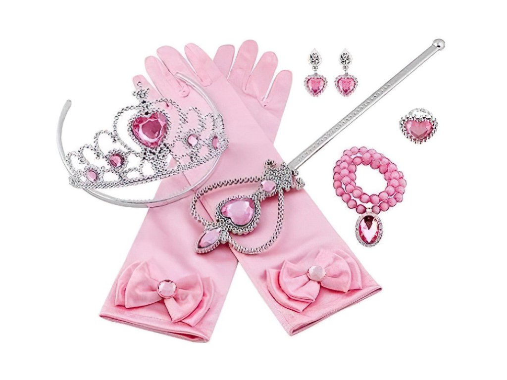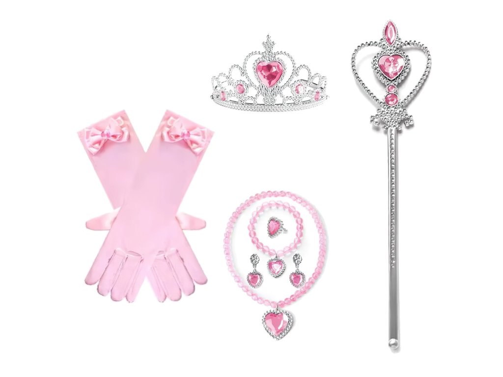 V sade nájdete nádhernú striebornú korunku so srdiečkovými ružovými kamienkami, čarovné žezlo v rovnakom štýle a elegantné saténové rukavičky v jemnej ružovej farbe. Súčasťou sú aj šperky, ktoré doladia každý princeznovský outfit – perlový náhrdelník, náramok, prstienok a náušnice so žiarivými ružovými kamienkami. Vďaka týmto doplnkom sa každé malé dievčatko môže cítiť ako skutočná princezná pripravená na bál.