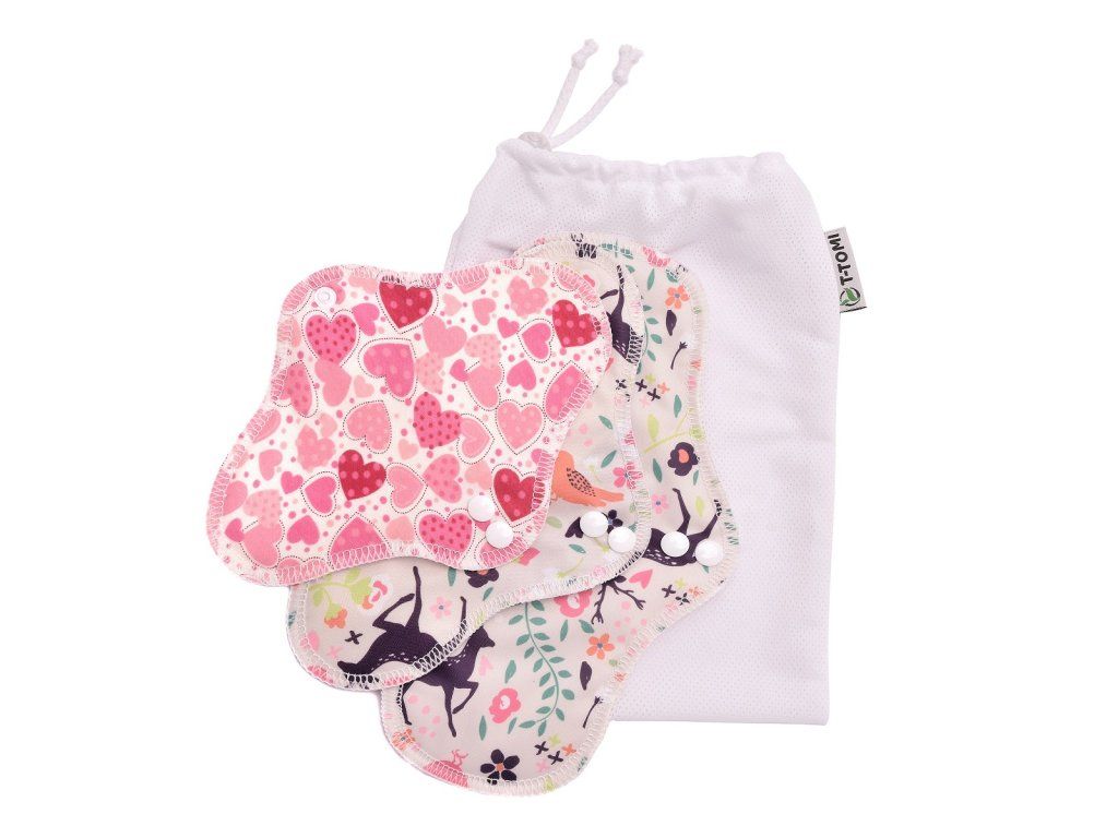 T-TOMI testovacia sada látkových vložiek je určená pre tých, ktorí by radi vyskúšali ekologickú variantu menštruačných vložiek. Sada obsahuje 1x látkovú vložku INTIM (spodná strana 100% bavlna, vnútorná strana dojčenský plyš), 1x látkovú vložku DENNÚ (spodná strana zo 100% polyestru s PUL záterom, stred – vysokogramážne froté, vnútorná strana dojčenský plyš) a 1x látkovú vložku NOČNÚ XL (spodná strana zo 100% polyestru s PUL záterom, spevnený stred – dve vrstvy vysokogramážneho froté a vrchná strana dojčenský plyš). Tieto vložky sú ZERO WASTE, a tak nevytvárajú žiadny zbytočný odpad a sú tak šetrné k životnému prostrediu i vašej peňaženke. Testovacia sada tiež obsahuje praktické vrecko na pranie.sada 3 ks látkových vložiek