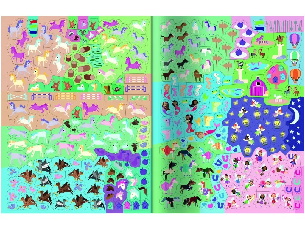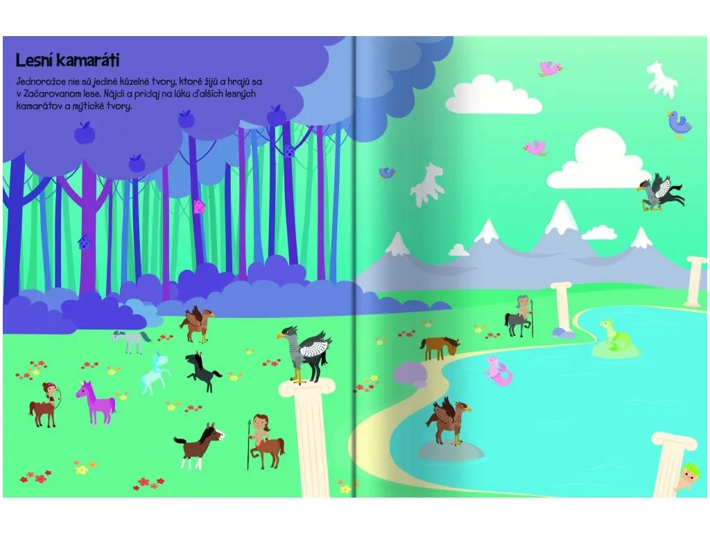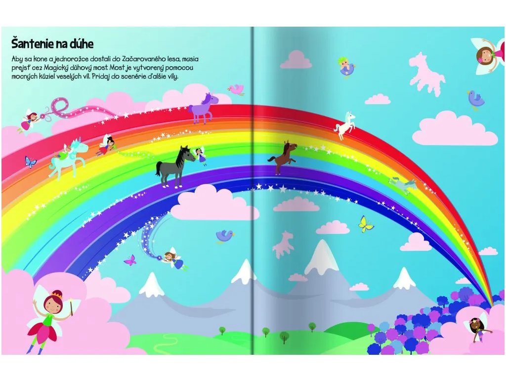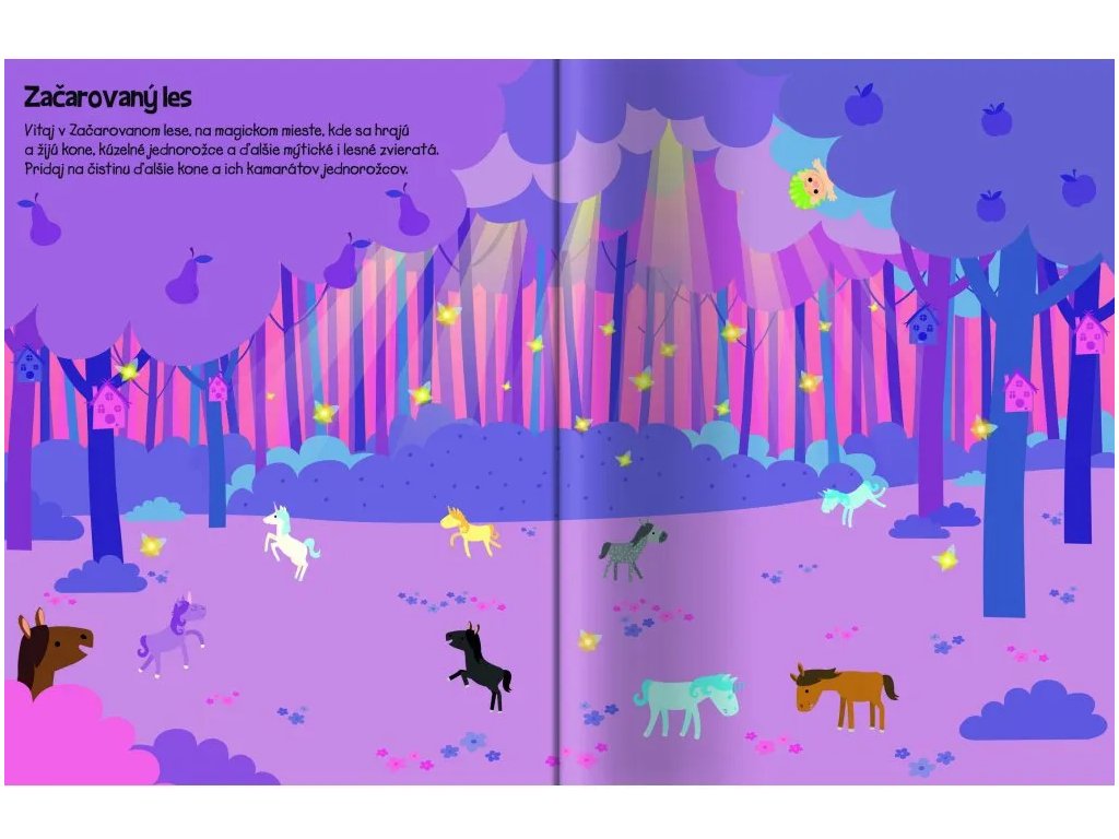 555 samolepiek - Kone a jednorožce Vytvorte si vlastný svet koní a jednorožcov so zošitom plným samolepiek V tomto úžasnom zošite na teba a tvoju fantáziu čaká viac ako 555 samolepiek! Vydaj sa do magického sveta hravých koní a čarovných jednorožcov zo Zakliateho lesa. Pripravte slávnostný sprievod poníkov, uži si honosný ples, pomôž nazbierať bobule z kríkov alebo si uži drezúru s jednorožcami z celého Začarovaného lesa! Rozvíjajte predstavivosť a jemnú motoriku detí Doplň množstvo samolepiek do nápaditých a magických scenérií a spoznaj tieto úžasné čarovné stvorenia.Dodatočné parametre