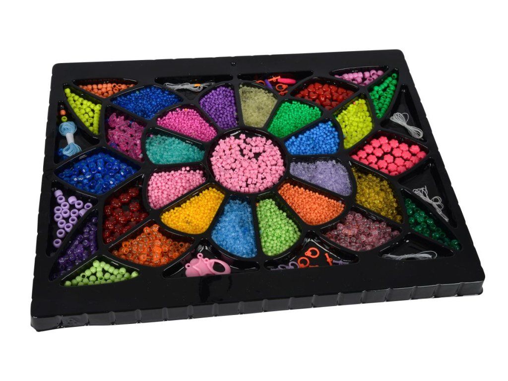 Súprava korálikov rôznych tvarov a farieb v darčekovom balení. Navliekacia šnúrka a spojky sú súčasťou. Obsahuje 10 000 korálikov.Dodatočné parametre