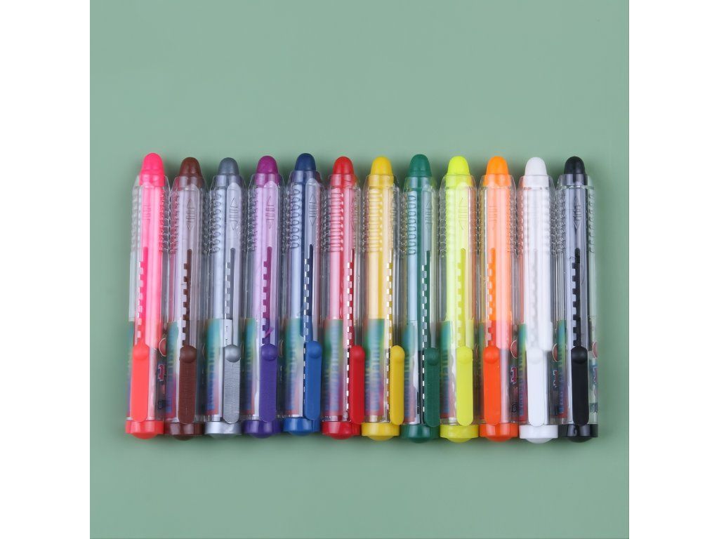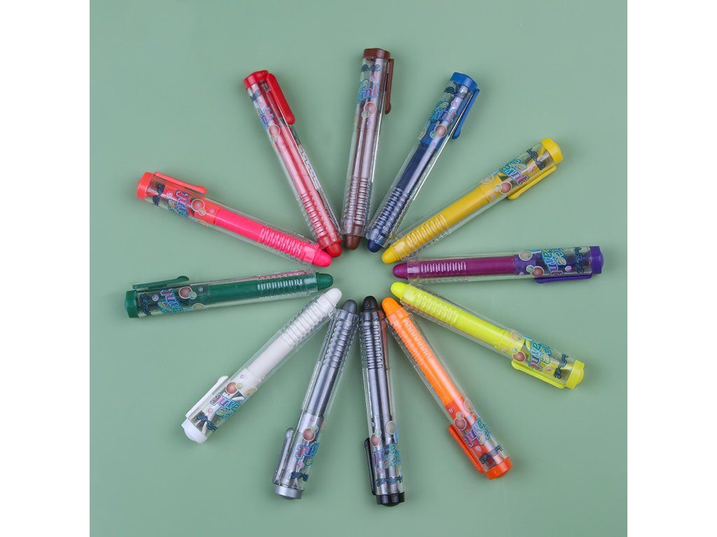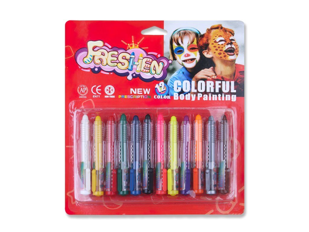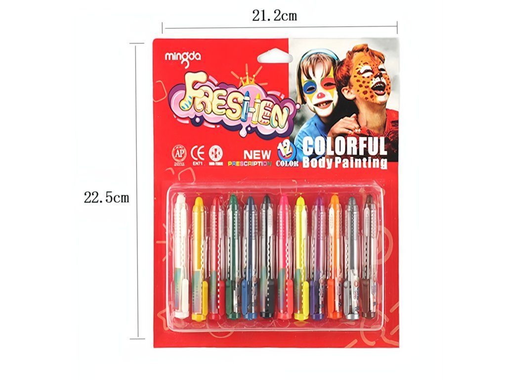 Detská sada farieb na tvár v ceruzke obsahuje 12 základných farieb, ktoré sú ideálne na hravé líčenie, karnevaly, oslavy alebo školské akcie.