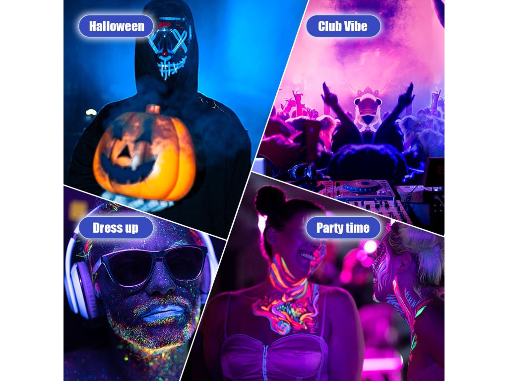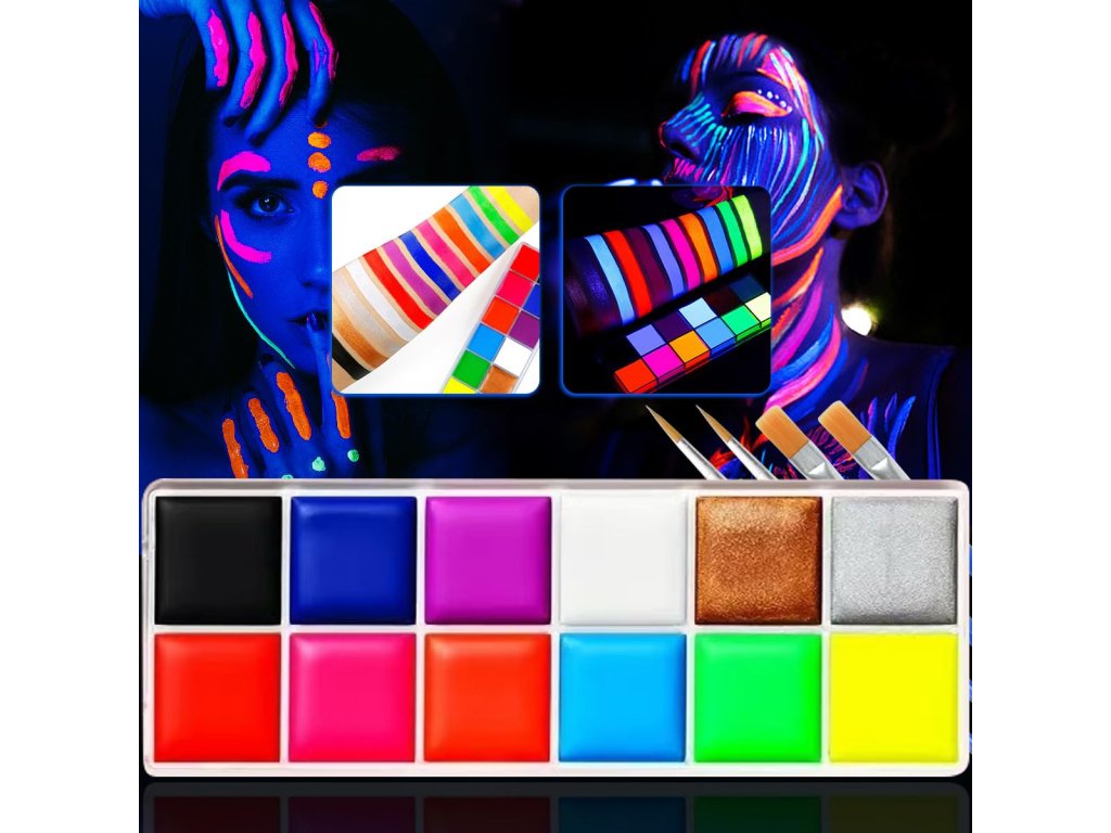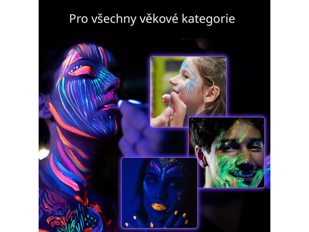 Sada neonových farieb na tvár a telo rozžiari každú detskú párty alebo karneval. Obsahuje 12 žiarivých odtieňov, ktoré sú navrhnuté tak, aby intenzívne svietili pod UV svetlom.