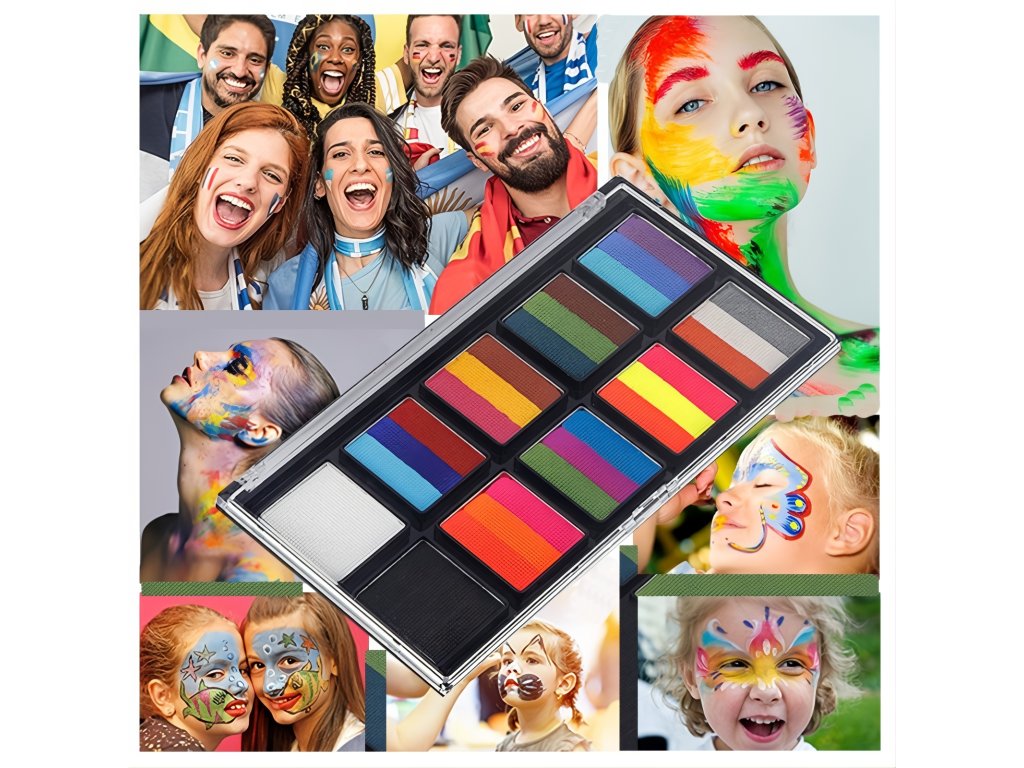 Dva bloky obsahujú základné farby – bielu a čiernu – vhodné na kontúry, detaily a zosvetľovanie. Ideálne pre detské oslavy, karnevaly, školské podujatia alebo halloweenske maľovanie.
