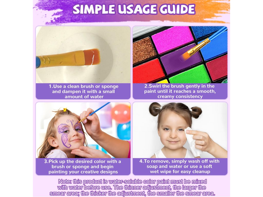 Farby sú na vodnej báze, hypoalergénne a dermatologicky šetrné, vhodné aj pre citlivú detskú pokožku. Ľahko sa nanášajú pomocou priloženého štetca a jednoducho zmývajú vodou a jemným mydlom.