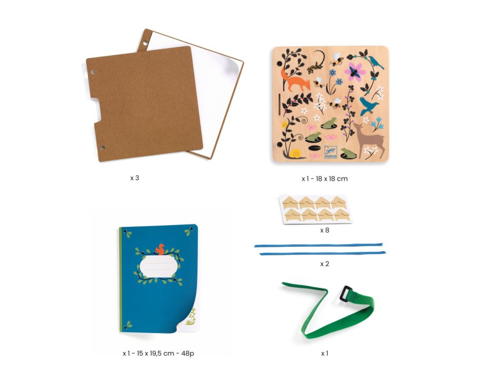 v balení: zostaviteľný lis + herbárový zošit + doplnky na lisovanie