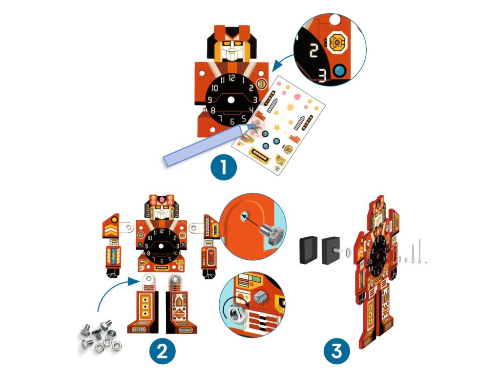 DIY Vyrob si sám Hodiny RobotZostav si robotické hodiny s mechanizmomDIY Vyrob si sám Hodiny Robot je dokonalá kreatívna sada pre deti, ktoré milujú tvorenie, skladačky a funkčné projekty. Deti si vlastnými rukami poskladajú funkčné nástenné hodiny v tvare robota – od spájania dielov skrutkami a maticami až po dekorovanie viac ako 80 obtlačkami/nálepkami. Sada obsahuje 5 pevných FSC® lepenkových častí, ktoré dieťa spojí pomocou skrutiek a dotvorí originálnymi obtlačkami. Špeciálna technika obtlačovania (šrafovanie ceruzkou cez fóliu) dodá dizajnu realistický metalický efekt. Po dokončení stačí vložiť tichý hodinový strojček (AA batéria nie je súčasťou balenia) a pridať ručičky. Kreatívny proces podporuje jemnú motoriku, sústredenie aj estetické cítenie. Kolekcia DIY – Vytvor si sám prináša deťom možnosť vytvoriť nielen dekoráciu, ale aj praktický predmet, na ktorý budú hrdé.Prečo si deti zamilujú Hodiny Robot?vyrábajú skutočné funkčné hodiny
