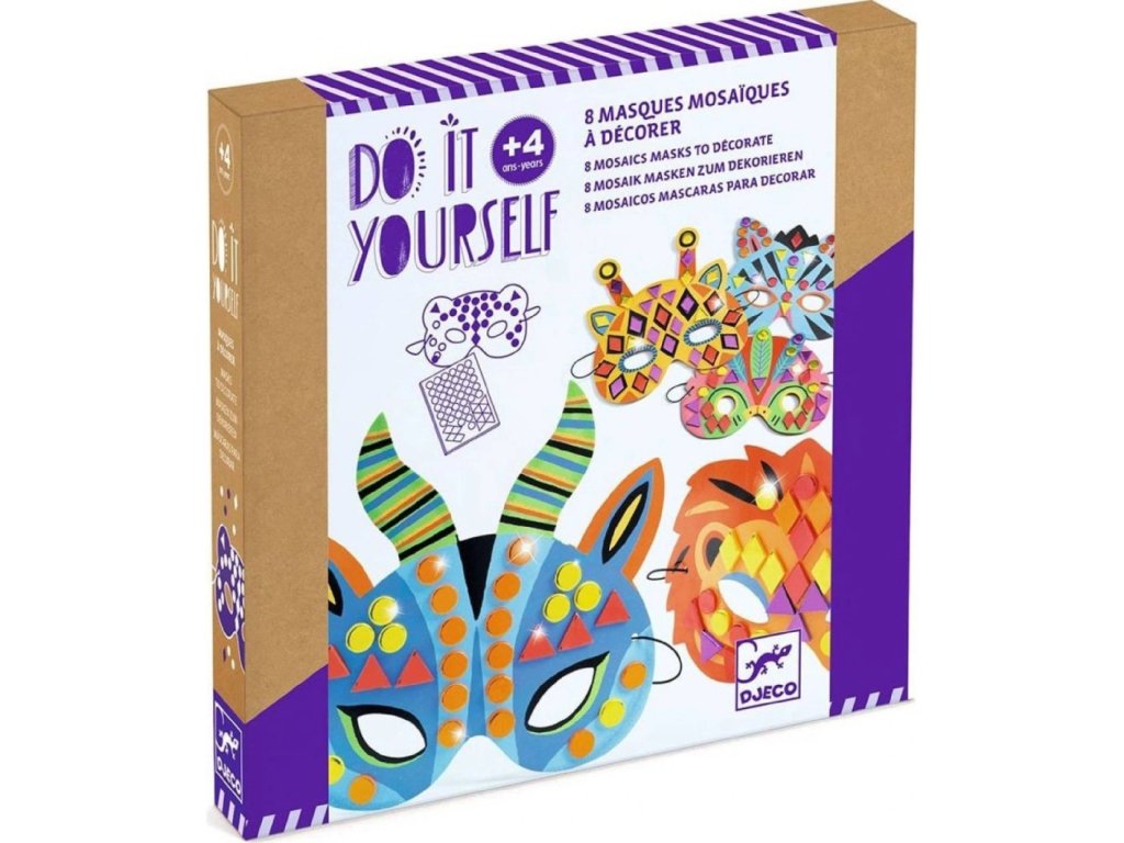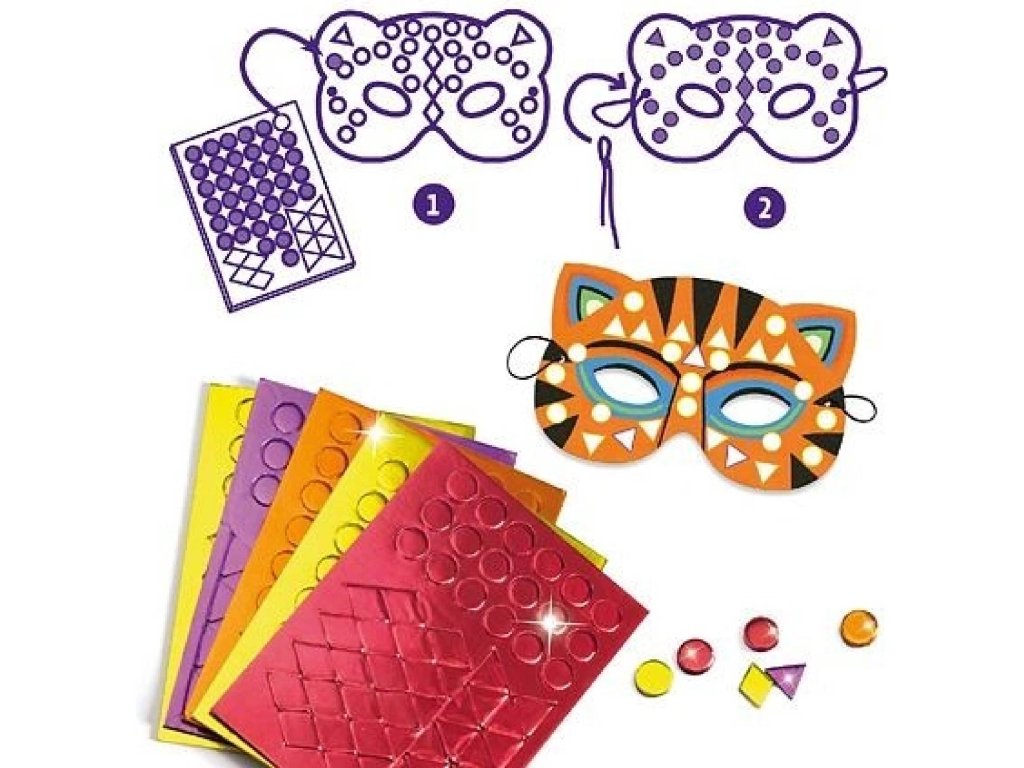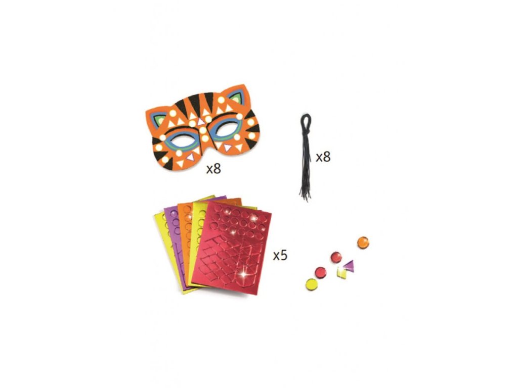 DIY Vyrob si sám Masky Zvieratá z džungle Vyrob si 8 masiek na oči! Keď ťa baví karneval, masky alebo hra na nejaké zviera, tak pomocou DIY sady Masky – Zvieratá džungle si môžeš vyrobiť až 8 rôznych masiek na oči. Masky sú z ohybného kartónu s výrezmi na oči. Netreba nič vyfarbovať, masky už majú potlač, stačí na biele miesta dolepiť mozaikové nálepky. Nálepky majú metalický vzhľad, čím dodajú maskám nápadný, efektný lesk. Na záver uviažeš na okraje masky gumku a môžeš si ju nasadiť na oči.Dodatočné parametre