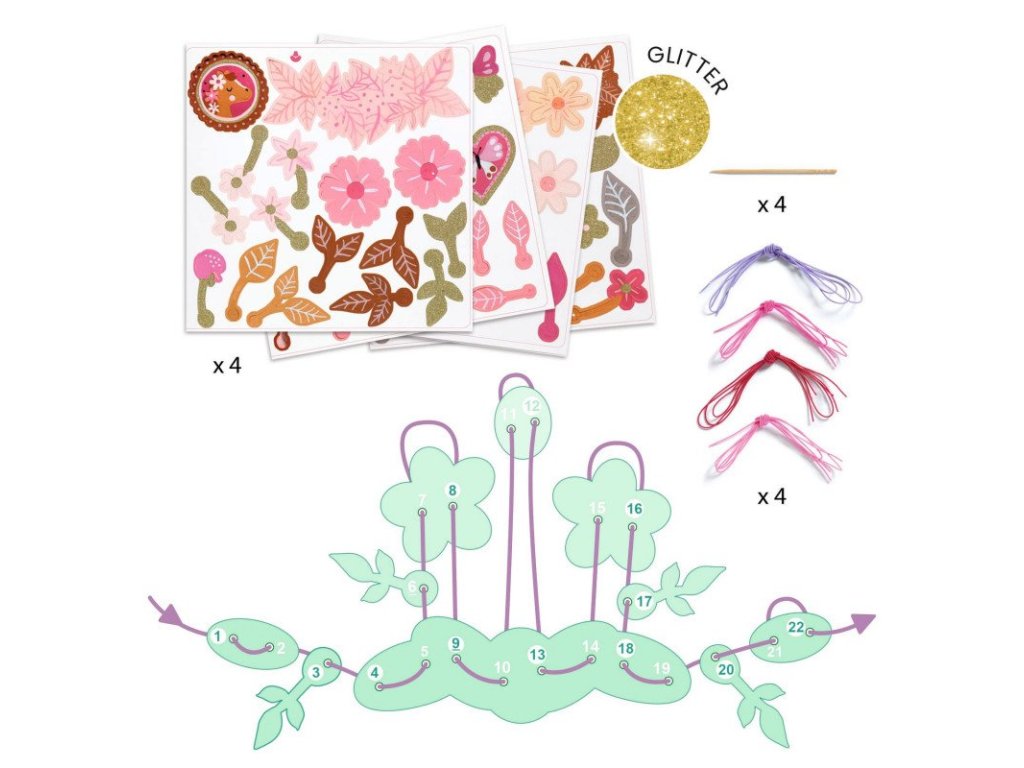Tvorenie je jednoduché a prehľadné: dieliky sú predrezané, predierované a očíslované. Stačí prevliekať farebnú elastickú šnúrku cez otvory v správnom poradí podľa návodu. Keď je šperk hotový, pomocné označenia sa prirodzene „stratia“ a zostane len krásny výsledok pripravený na nosenie alebo darovanie.