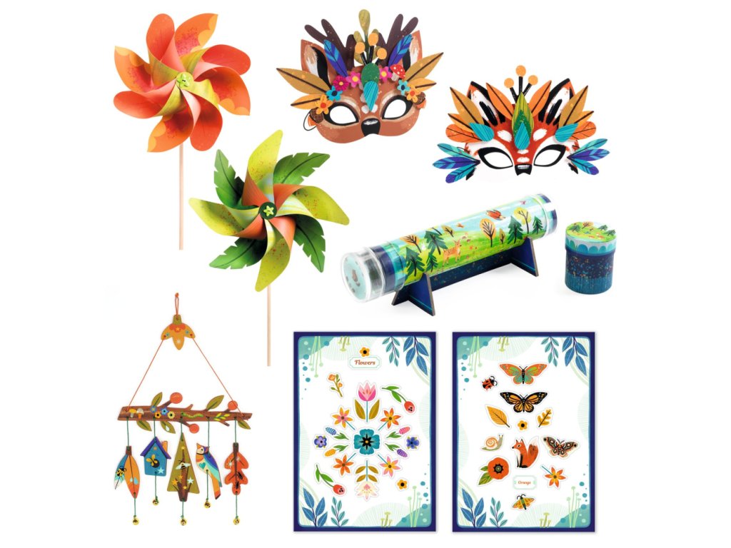 Príroda v strede záujmu! Sada 5 kreatívnych aktivít obsahuje všetko potrebné na zhotovenie 12 výtvorov, ktoré spája téma prírody. Vzniknú 2 zvieracie masky (hráme sa na zvieratá), 2 vrtuľky a 1 zvonkohra (hráme sa s vetrom), 6 plagátikov (vytvárame kategórie) a 1 kaleidoskop (pozorovanie je magická činnosť). Sada vystačí na hodiny kreatívnej zábavy a je vhodná aj pre skupinku detí.Papier a kartón použitý na výrobu sady má ekologický certifikát FSC®. Kolekcia Vytvor si sám (DIY) má blízko k úžitkovému umeniu a umožňuje deťom zhotoviť umelecké výrobky, ktoré si môžu nielen hrdo vystaviť, ale ich aj používať.Obsah: 2 masky na ozdobenie: 80 ks ilustrovaných papierových dielov, 2 hárky obojstranných lepiek, 2 elastické šnúrky (gumky); 2 vrtuľky na poskladanie: 4 hárky s vyrezanými ilustrovanými dielmi, 2 drevené paličky, 2 plastové koncovky (čiapočky); 1 kaleidoskop na poskladanie: 1 ilustrovaný tubus, násada s krytkou (plast) na vloženie farebných dielikov a kotúčov na pozorovanie, 3 zrkadlá (zrkadlová fólia), 1 okulár so šošovkou (plast a papier), 1 pinzetka, 11 ilustrovaných kotúčov, 50 ks farebných dielikov, škatuľka s vekom na uskladnenie dielikov a kotúčov, ilustrovaný stojan; 6 obrázkov (plagátov) s prírodnými motívmi na dotvorenie: 4 hárky samolepiek (zvieratká a rastlinky), 1 hárok samolepiacich menoviek, odkladacia mapa s gumičkou; 1 závesná dekorácia (zvonkohra) na ozdobenie: 2 hárky obtlačkov, 7 ilustrovaných dielov, 2 ks farebných šnúr, 5 zvončekov; 1 obrázkový návod pre každú aktivituDodatočné parametre
