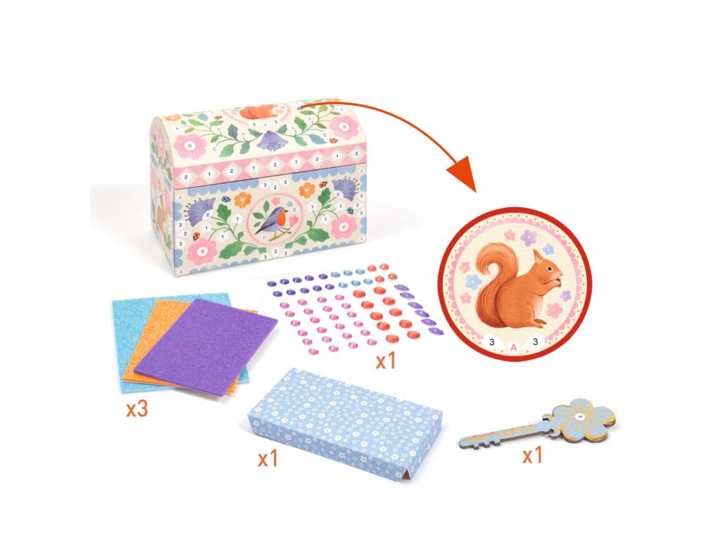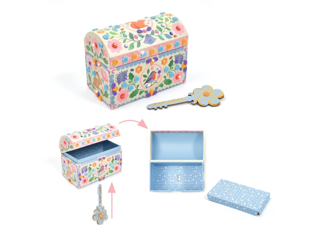 DIY Vyrob si sám truhlicu Vzácny pokladTruhlica, ktorá ukryje tajomstvá aj tie najcennejšie detské pokladyKaždé dieťa má svoje malé tajomstvá a vzácne drobnosti, ktoré si chce starostlivo schovať. Táto nádherná kreatívna sada od Djeco im umožní vytvoriť si vlastnú pokladnicu, ktorá bude nielen krásna, ale aj funkčná. Deti si truhlicu najskôr poskladajú, potom ozdobia trblietavými mozaikami a lesklými „drahokamami“, a nakoniec do nej uložia všetko, čo je pre ne dôležité – od náramkov a lístočkov až po malé tajné správy. Skutočnú magickosť dodáva truhlici tajné falošné dno, ktoré sa otvára pomocou malého kľúčika. Ideálne miesto pre najvzácnejšie poklady, ktoré chce majiteľ ukryť pred zvedavými očami.Čo sa skrýva v sade?Pevná kartónová truhlica s otváracím tajným dnom