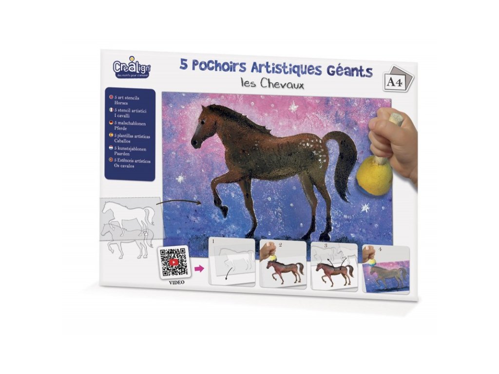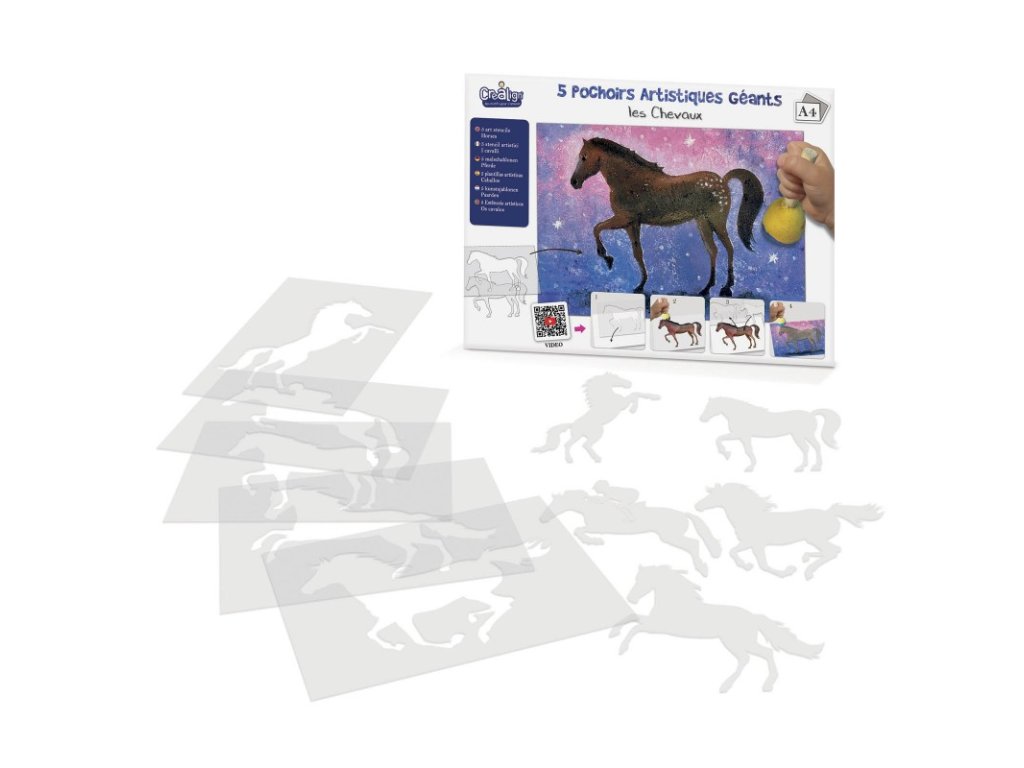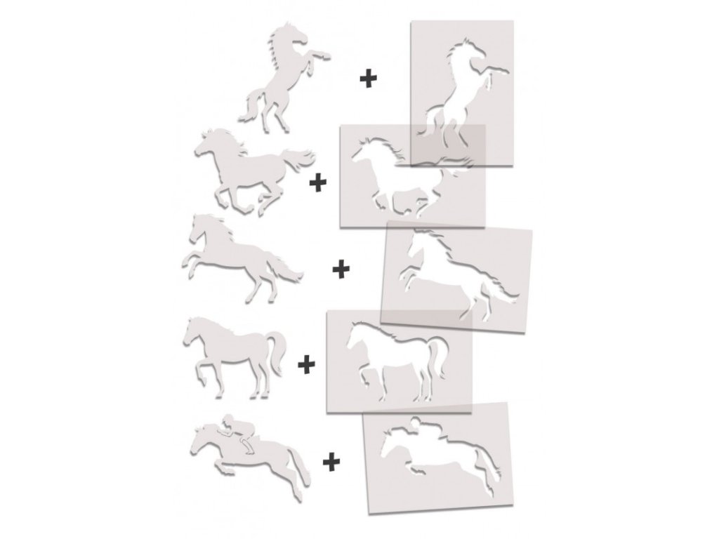 V sade nájdeš 5 šablón koní v rôznych postojoch a 5 protiforiem (vnútorných výrezov).