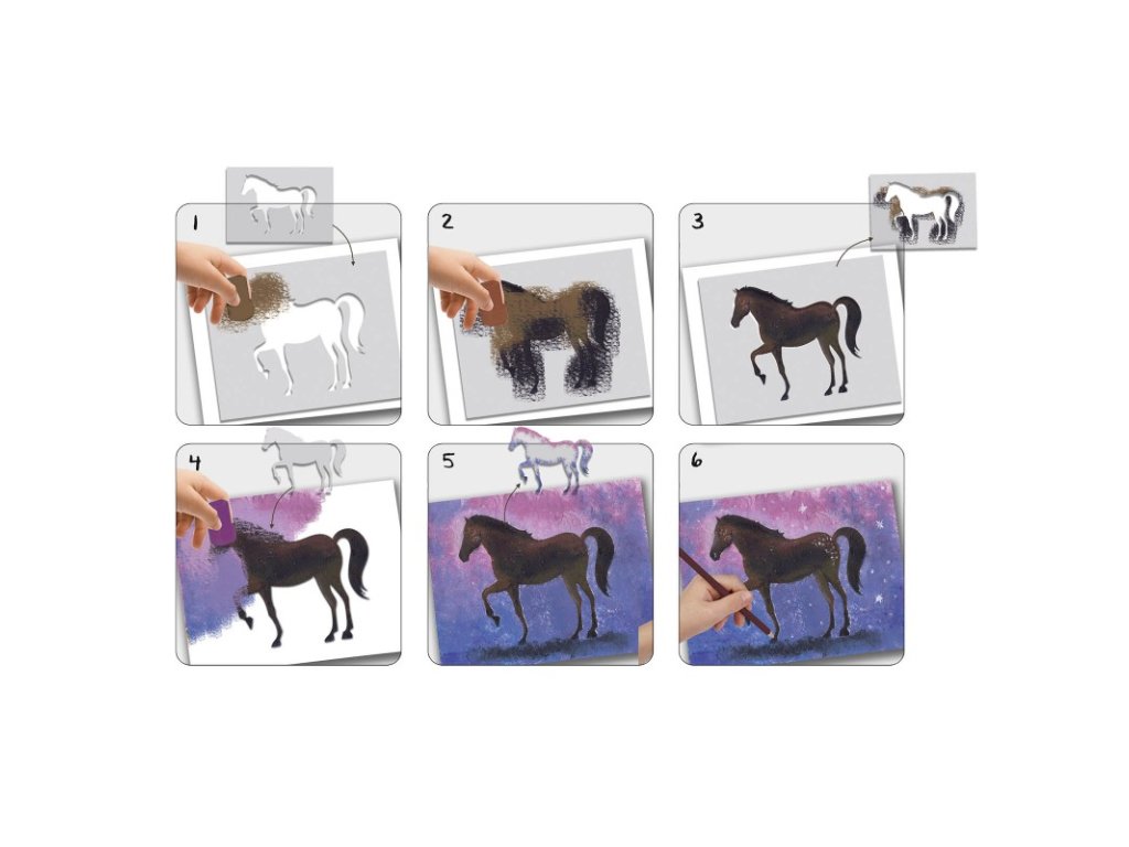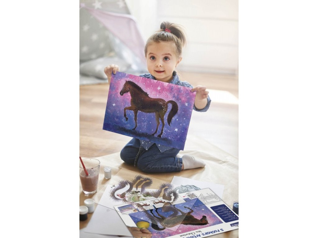 čo dieťa vytvorí: kone v rôznych postojoch + vlastné pozadie a detaily