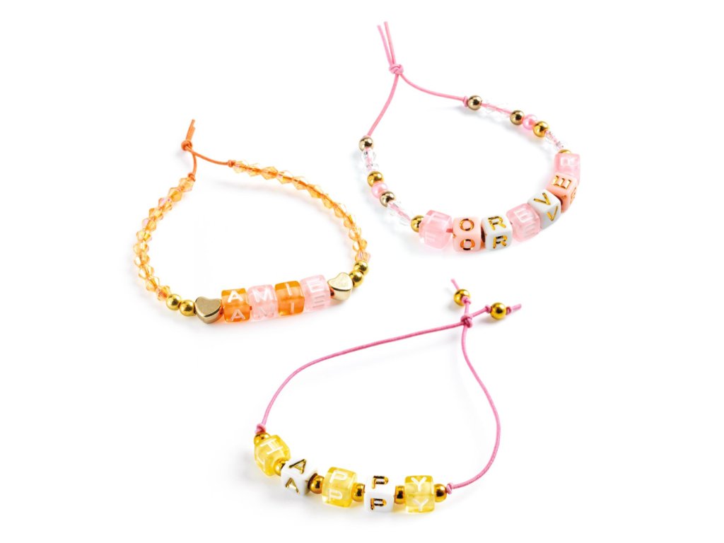 Zlaté korálky krásne dopĺňajú farebné písmenkové korálky, pričom medzi menšími korálkami nájdete aj srdiečka, ktoré dodávajú šperkom špeciálny, hravý nádych. Všetky farby sú zladené, takže každý náramok bude esteticky príťažlivý a jedinečný. Navliekanie korálok je jednoduché a zábavné – deti používajú elastickú šnúrku, na ktorú korálky navliekajú s pomocou šikovnej ihly. Po dokončení náramok stačí zaviazať na uzlík a vďaka elastickej šnúrke ho možno ľahko nasadiť aj zložiť.