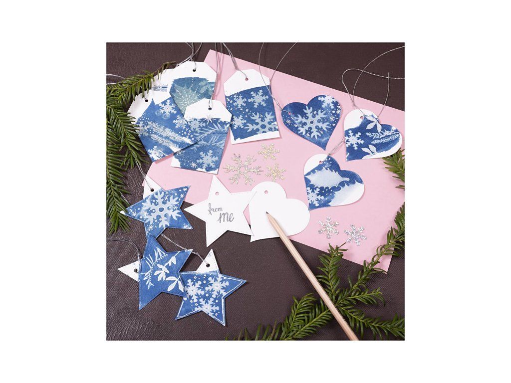 Elegantná kreatívna sada pre dospelých, ktorá prináša kúzlo výtvarnej techniky kyanotypie priamo k vášmu vianočnému baleniu darčekov. Vytvorte si vlastné originálne visačky v odtieňoch modrej - jedinečné, štýlové a osobné.