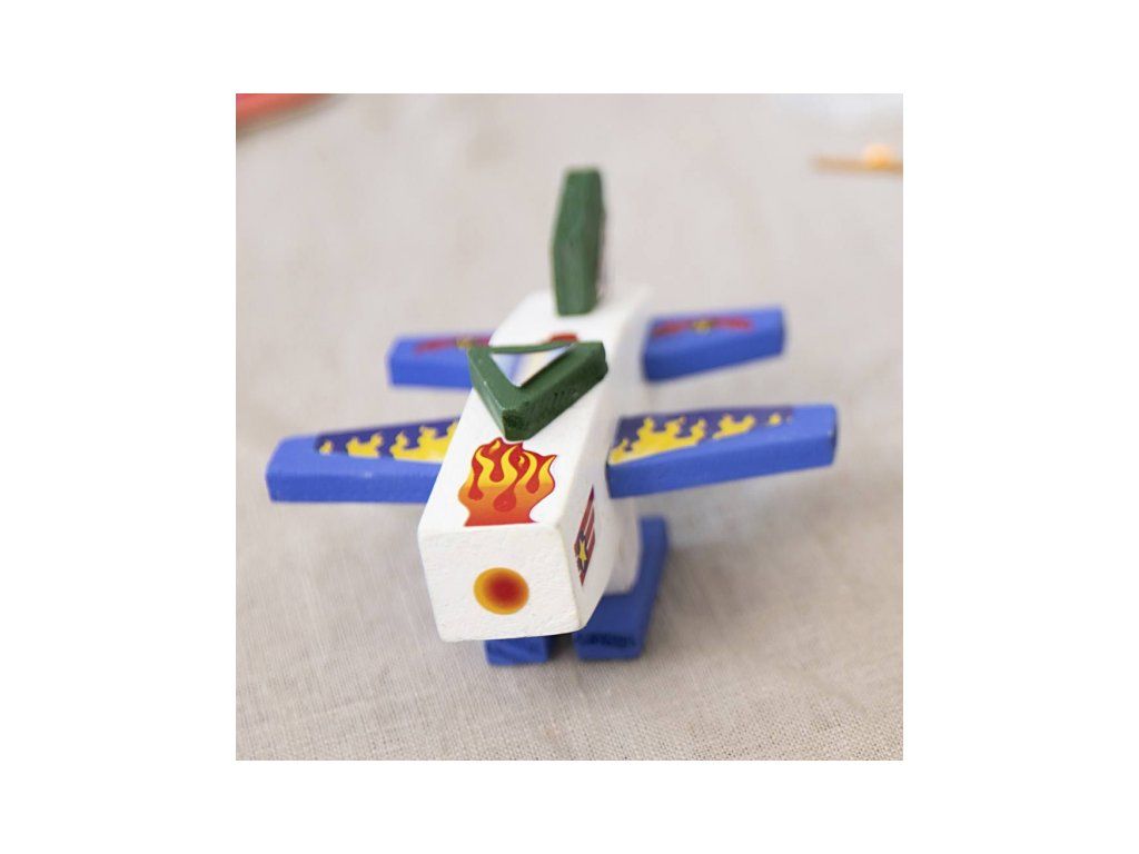 Originálna kreatívna súprava na výrobu dreveného lietadla deťom umožní postaviť si vlastnú hračku od úplného začiatku – najprv jednotlivé diely nafarbia, nechajú zaschnúť, potom ich zlepia a nakoniec dozdobia samolepkami. Výsledkom je jedinečné lietadlo pripravené na hranie aj vystavenie v detskej izbe.
